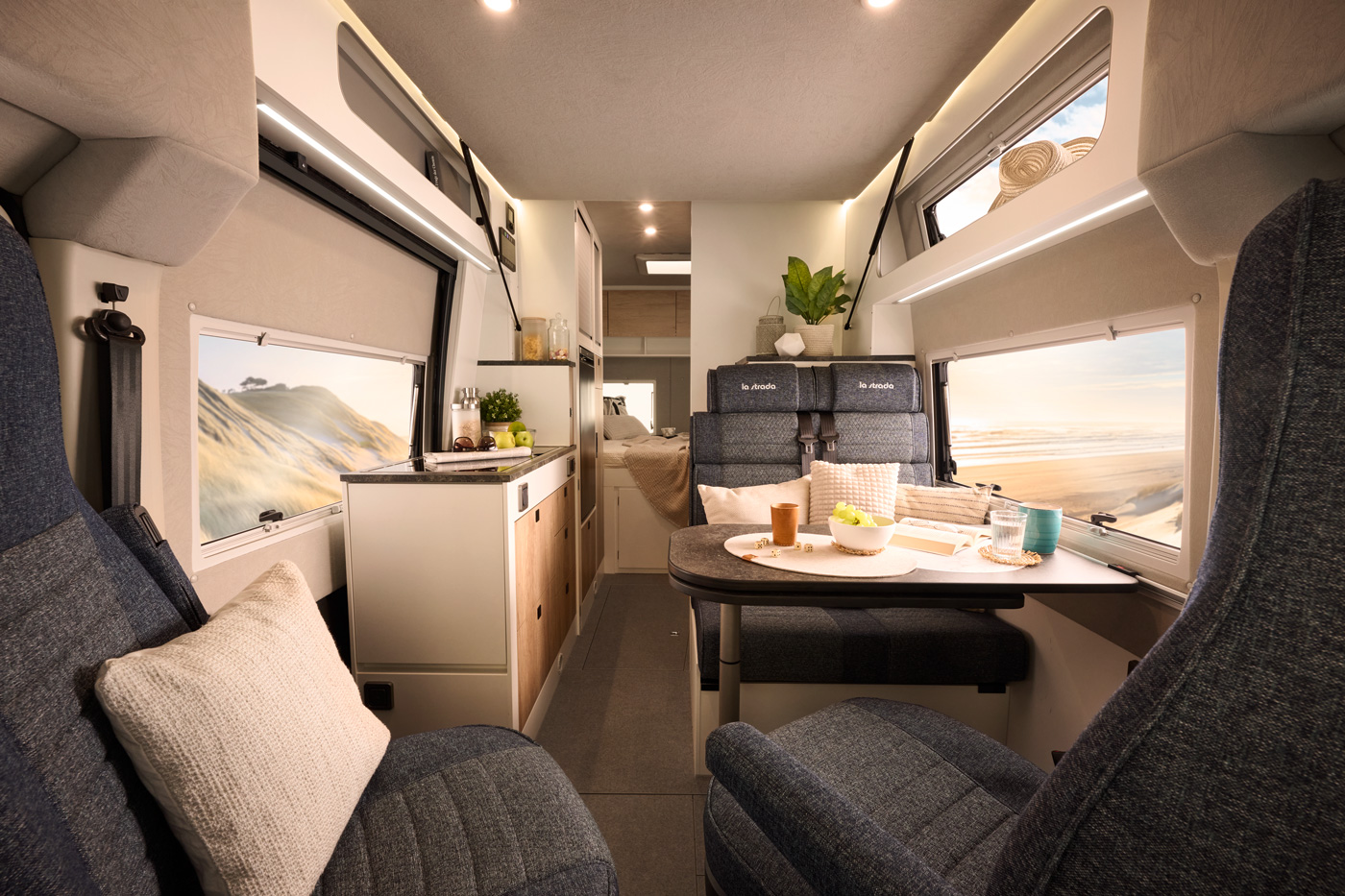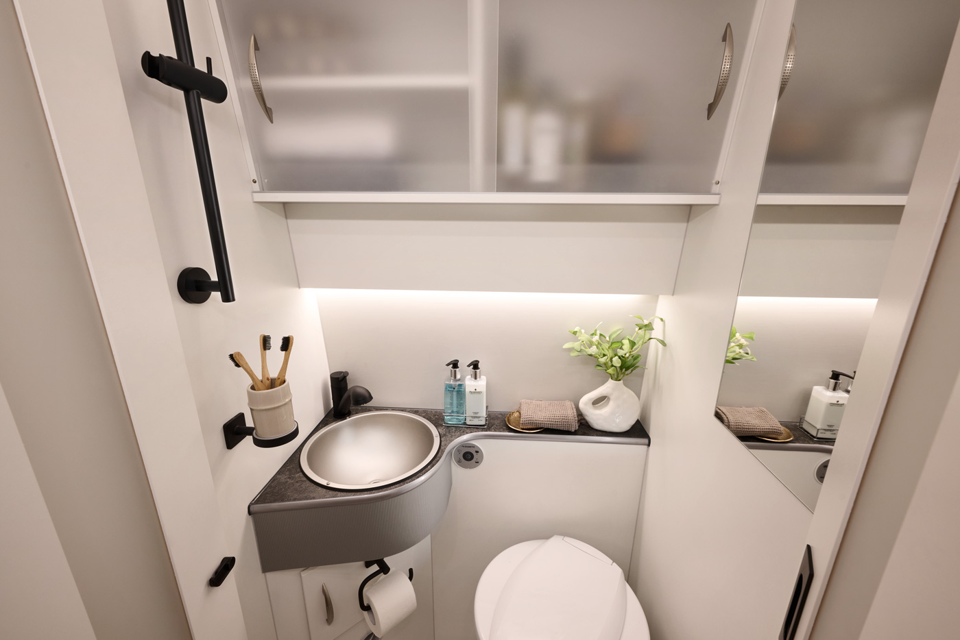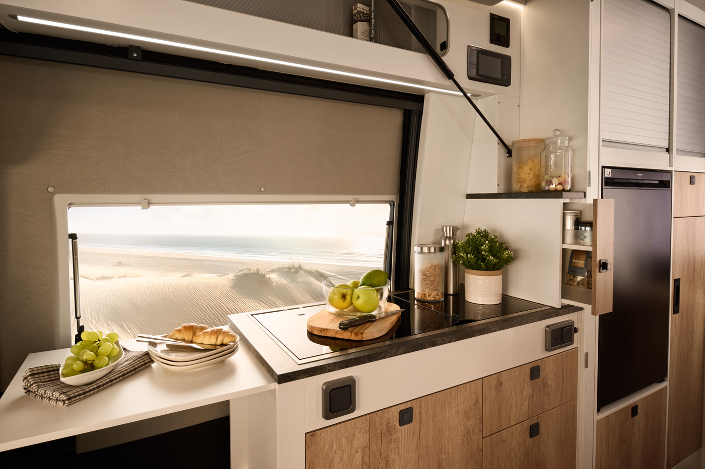 Im Innenraum zeigt sich der AVANTI F hell, funktional und gut organisiert. Das kompakte Bad ist durchdacht ausgestattet und bietet praktische Ablagen, die Küche überzeugt mit großzügiger Arbeitsfläche, drei Kochfeldern und einem modernen AES-Kühlschrank. Zahlreiche Stauräume im gesamten Fahrzeug sorgen dafür, dass Gepäck und Ausrüstung übersichtlich verstaut sind. So entsteht ein alltagstauglicher Campervan, der Komfort, Flexibilität und Platz für Familienreisen verbindet.