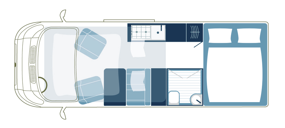 Der la strada AVANTI F ist auf Reisen mit mehreren Personen ausgelegt und nutzt den verfügbaren Raum besonders effizient. Statt Längsbetten verfügt er im Heck über ein Querbett, das Platz spart und zusätzlichen Stauraum im Inneren des Fahrzeugs schafft – ein klarer Vorteil auf Touren mit vier Reisenden. Ergänzt wird das Schlafkonzept durch ein bequemes Hubbett über dem Cockpit und der Sitzgruppe, das sich leicht absenken lässt und nachts den Zugang zum Bad freilässt.