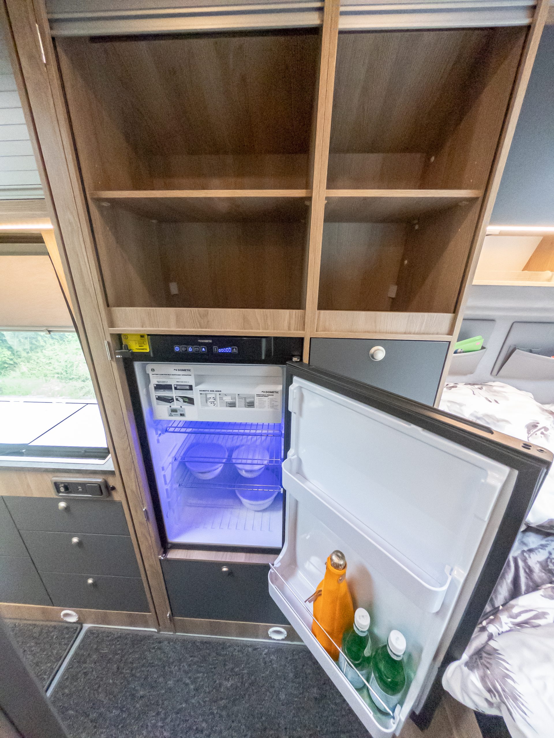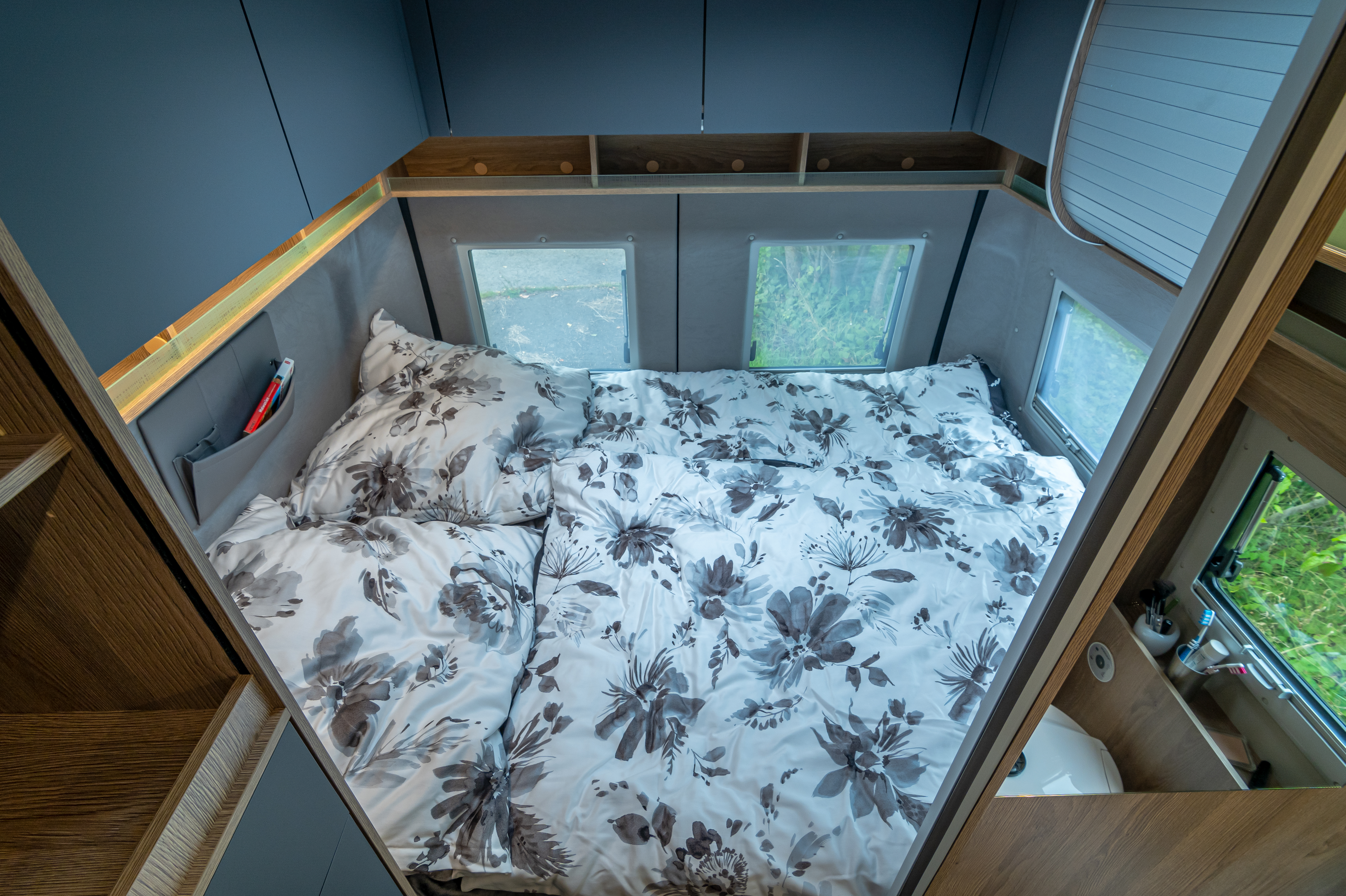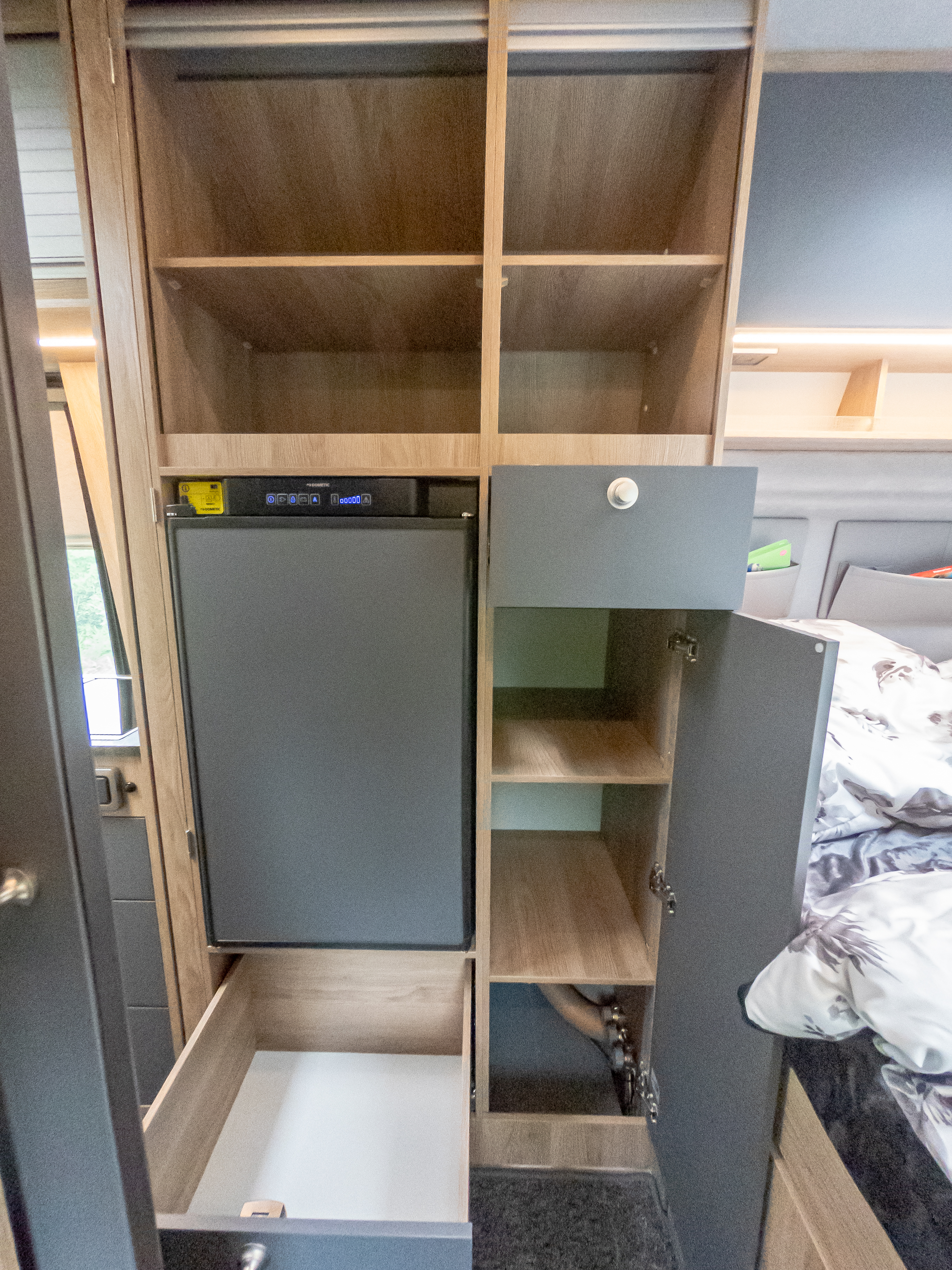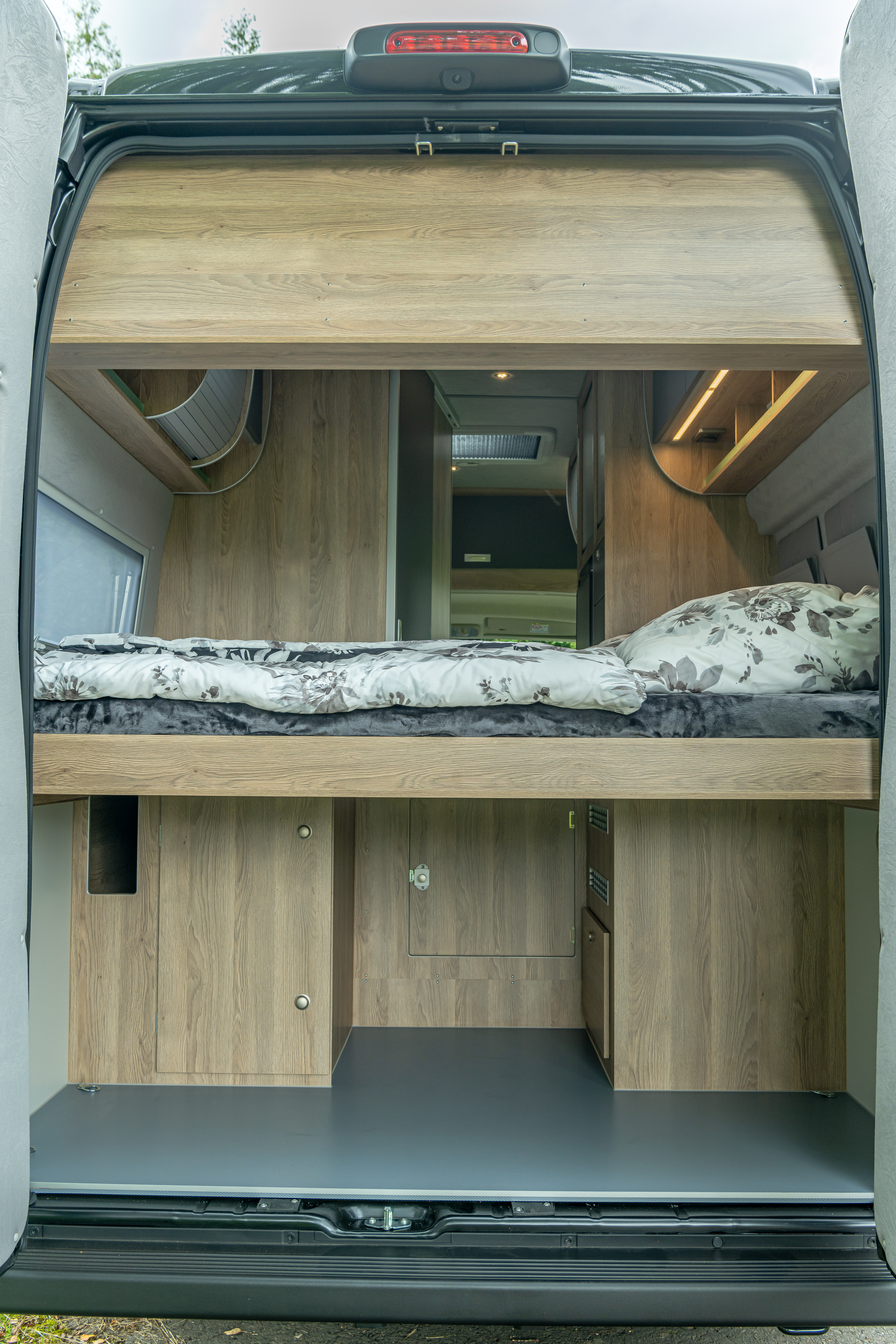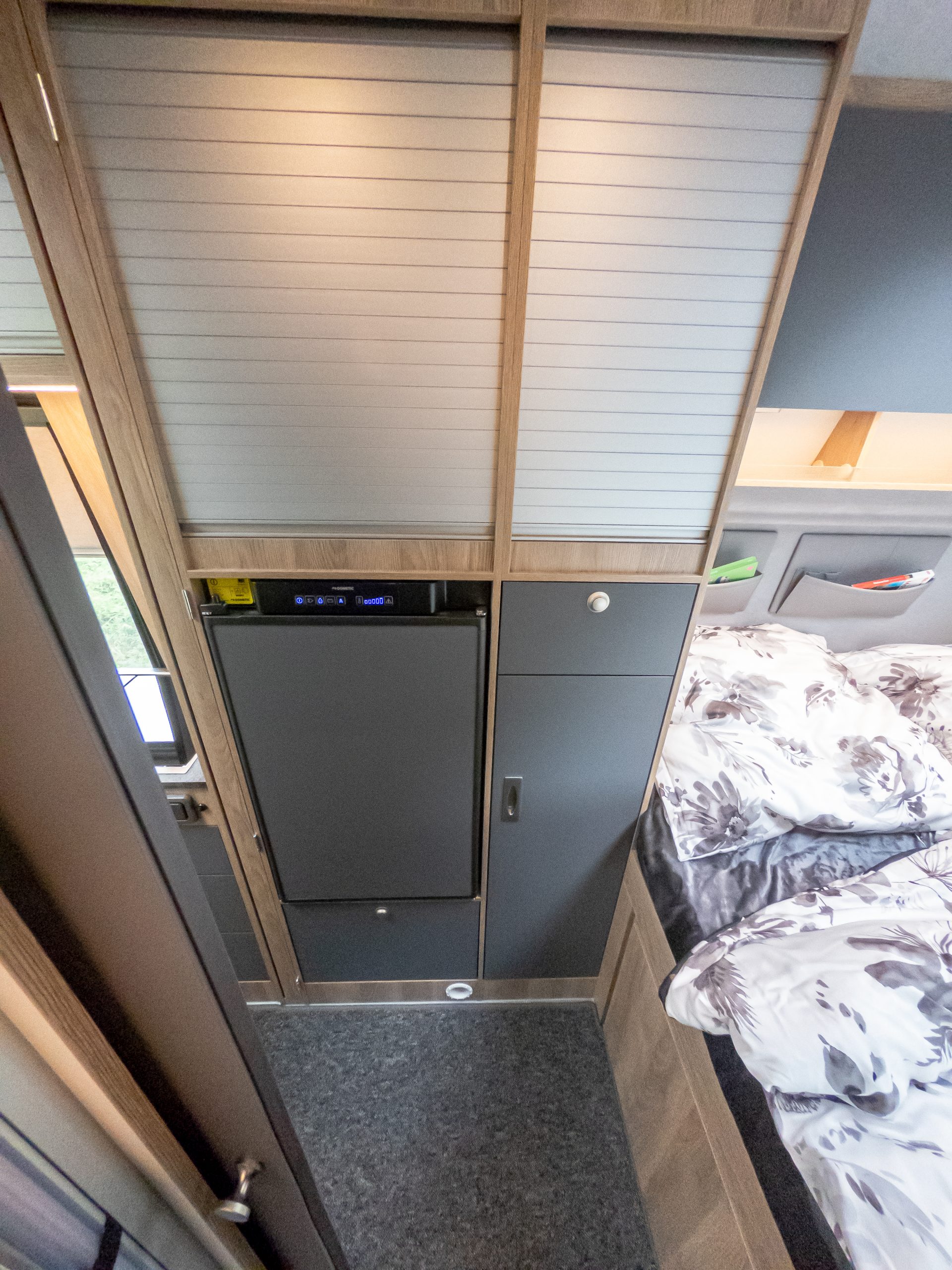 Ein seltenes Komfortmerkmal in der Fahrzeugklasse der Kastenwagen Reisemobile ist der beheizte Doppelboden. Im Wohnbereich punktet er mit Platz für Werkzeug, Schuhe und andere Utensilien. Dafür sorgen unterschiedlich große Klappen im Fußboden, über die der Doppelboden von oben zugänglich ist. Bei geöffneter Schiebetür fährt unter dem Küchenblock eine große Schublade aus, die zugleich als Stauraum und Außentisch nutzbar ist. Die durch den Doppelboden geleitete Warmluft der Heizung sorgt auch an kalten Tagen für warme Füße. Weiterer Stauraum für Kleidung findet sich in den Deckenschränken über dem Heckbett und dem Kleiderschrank neben dem Kühlschrank, zusätzliches Gepäck schluckt das große Staufach über dem Fahrerhaus.