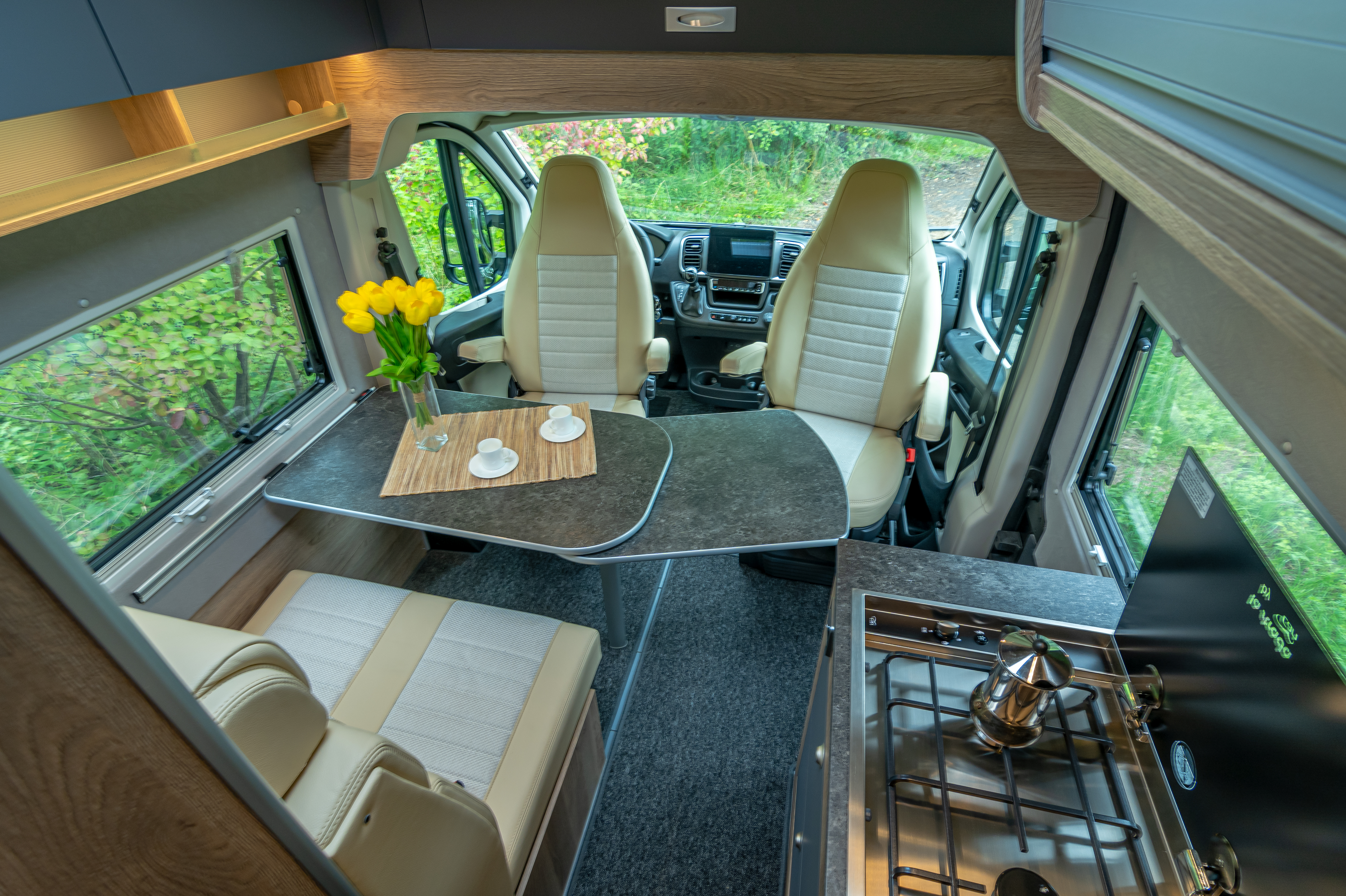 Bequem geht es auch in der Sitzgruppe des Avanti C zu, die sich im vorderen Teil des Fahrzeugs befindet. Hier entsteht durch Drehen der Fahrerhaussitze eine Sitzgruppe für bis zu 4 Personen. Im Fahrerhaus wird eine neue Polsterung über die serienmäßigen Sitze des Fiat Ducato gezogen. Verstärkungen und Einlagen sorgen für mehr Festigkeit, eine deutlich verbesserte Ergonomie und mehr Seitenhalt. Auch die Kunststoffarmlehnen der Fahrerhaussitze erhalten einen angenehmen Stoffüberzug. Die Sitzbank der Halbdinette ist ausgestattet mit zwei Drei-Punkt-Gurten und einer Isofix-Befestigung mit Top-Tether am Fensterplatz. Rückbank und Sitzfläche lassen sich verstellen: Mit senkrechter Lehne für den Fahrbetrieb und mit zurückgelegter Lehne und vorgerückter Sitzfläche für den Wohnbetrieb. Für bequemes Sitzen in allen Positionen sorgt die konvexe Form der Sitzlehne, die sich dem Rücken anpasst, gemeinsam mit den höhenverstellbaren Kopfstützen.