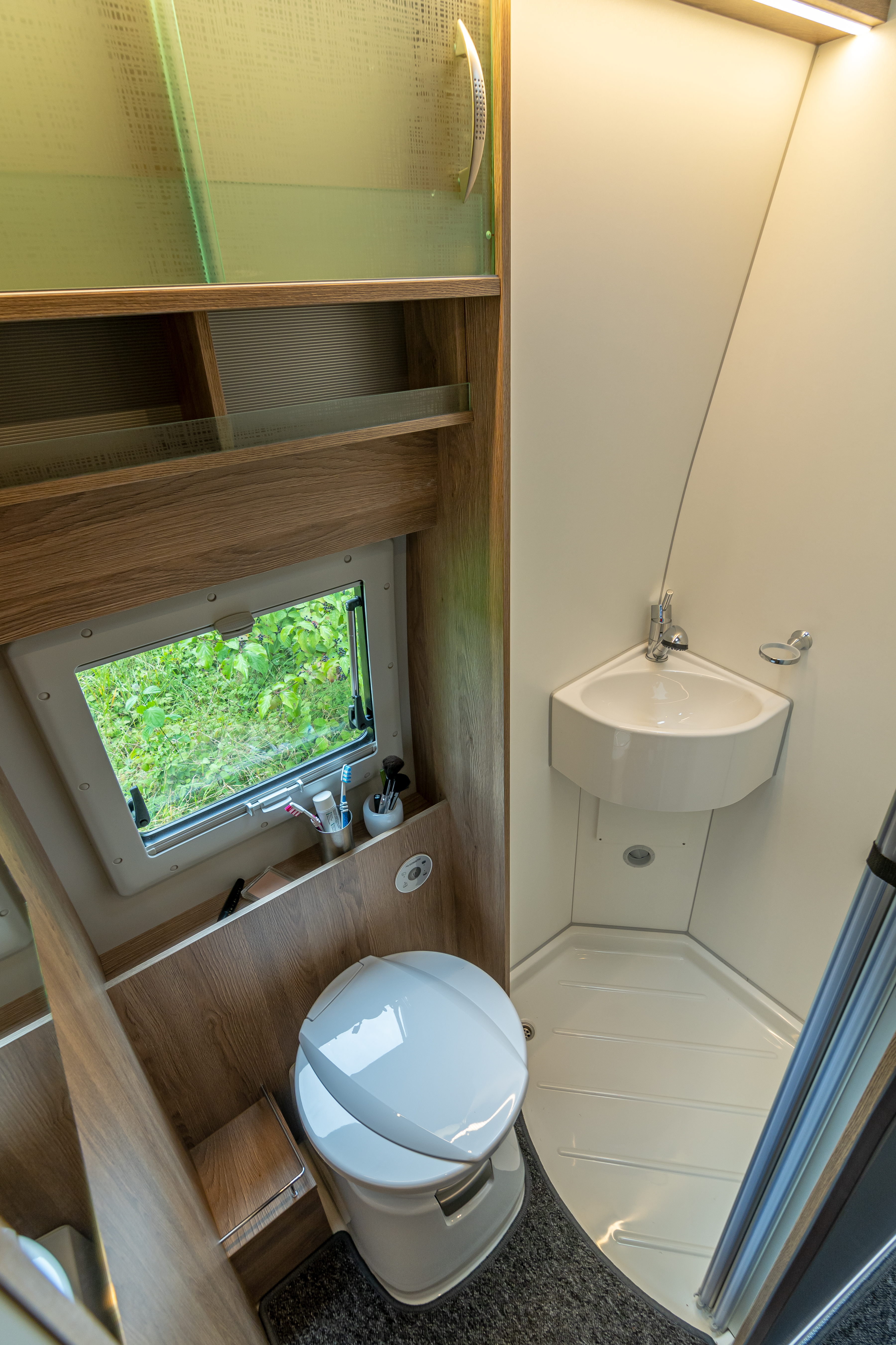 Der C verfügt über eine abgetrennte vollwertige Dusche. Eine Kunststofftür trennt dabei den Duschbereich vom restlichen Bad ab. Eine Keramiktoilette, Waschbecken und Stauraum für Hygieneartikel gehören zur weiteren Ausstattung des Bades, das durch eine platzsparende Schiebetür betreten wird. Komfortabel geht es auch im breiten Heckbett des Avanti C zu. Dafür sorgen ein Froli Tellerfedersystem und zwei Kaltschaummatratzen, die zusammen ein Doppelbett in den Maßen 197 mal 142 Zentimeter ergeben.