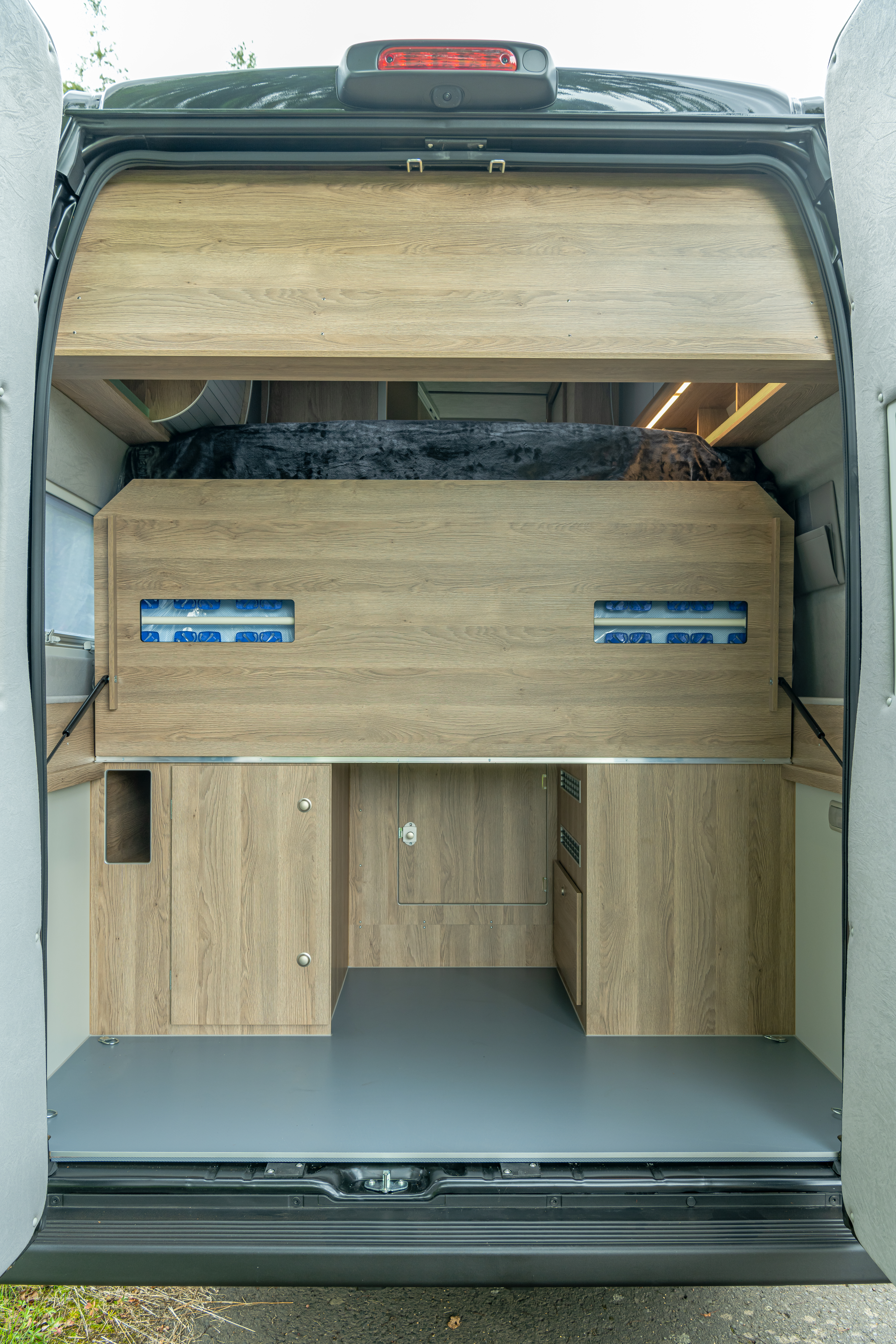 Unter dem Bett befindet sich der Heckstauraum, der sowohl durch eine Klappe vom Innenraum her als auch über die großen Flügeltüren der Karosserie zugänglich ist. Hier findet die Bordtechnik des Avanti C mit Heizung, Batterien, Bordelektrik und zwei 11 Kilogramm Gasflaschen ebenso Platz wie zusätzliches Gepäck. Der besondere Clou des Avanti C Stauraums: Der hintere Teil des Heckbettes lässt sich über die gesamte Fahrzeugbreite hochklappen. So entsteht ein üppiger Stauraum bis unter die Decke des Reisemobils. Die Tiefe ist ausreichend, um zwei Fahrräder quer im Heck zu verstauen.