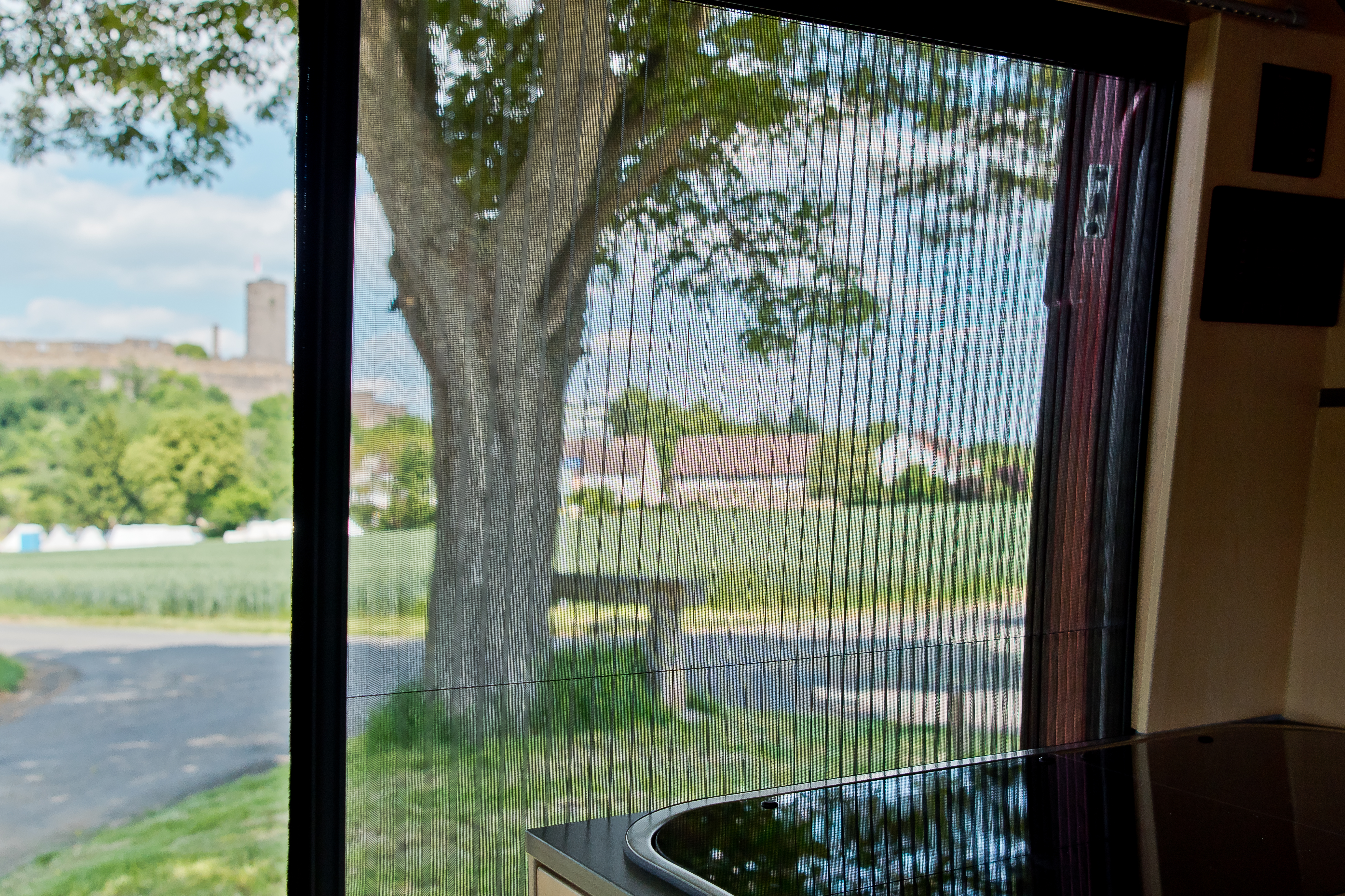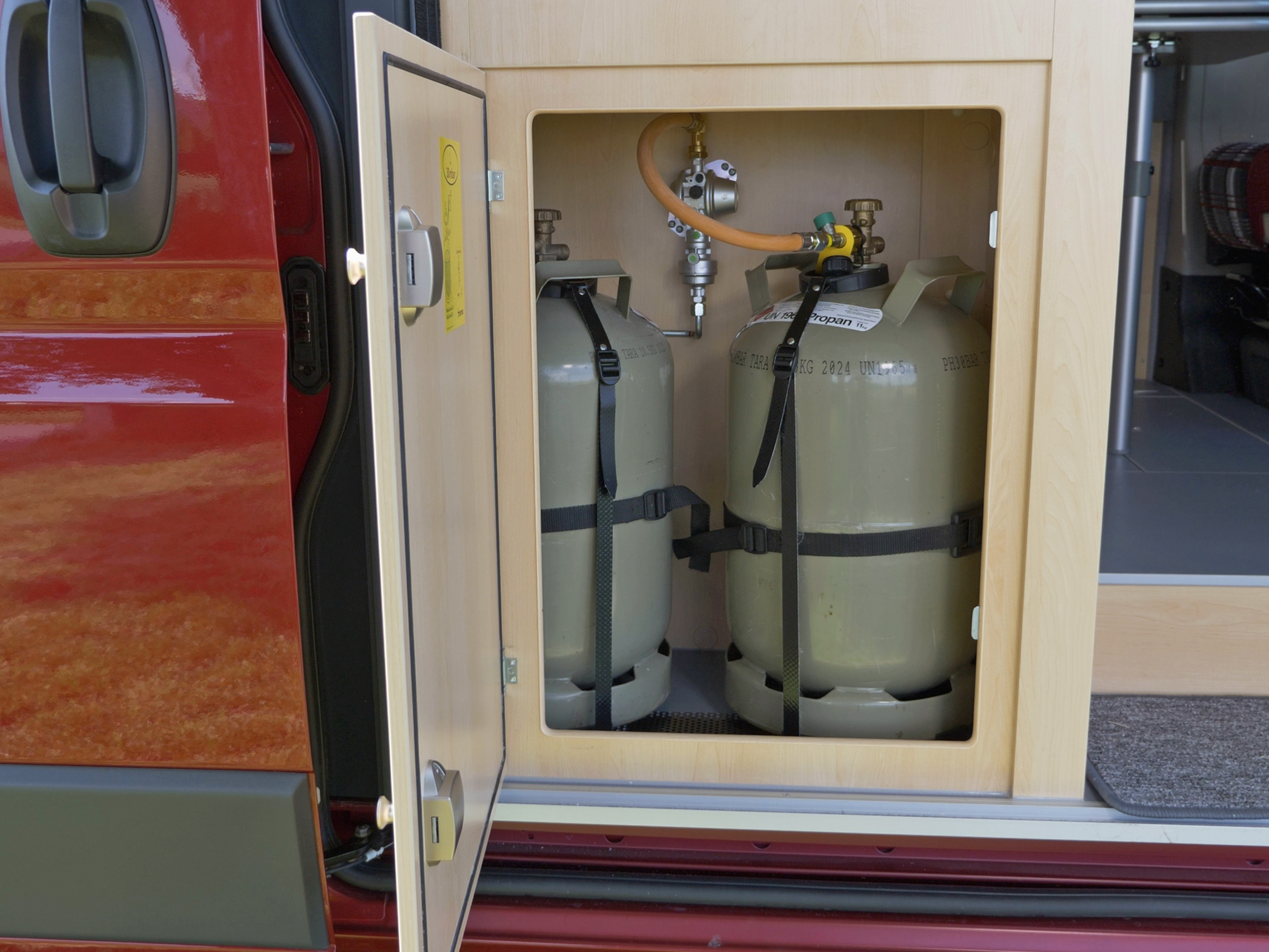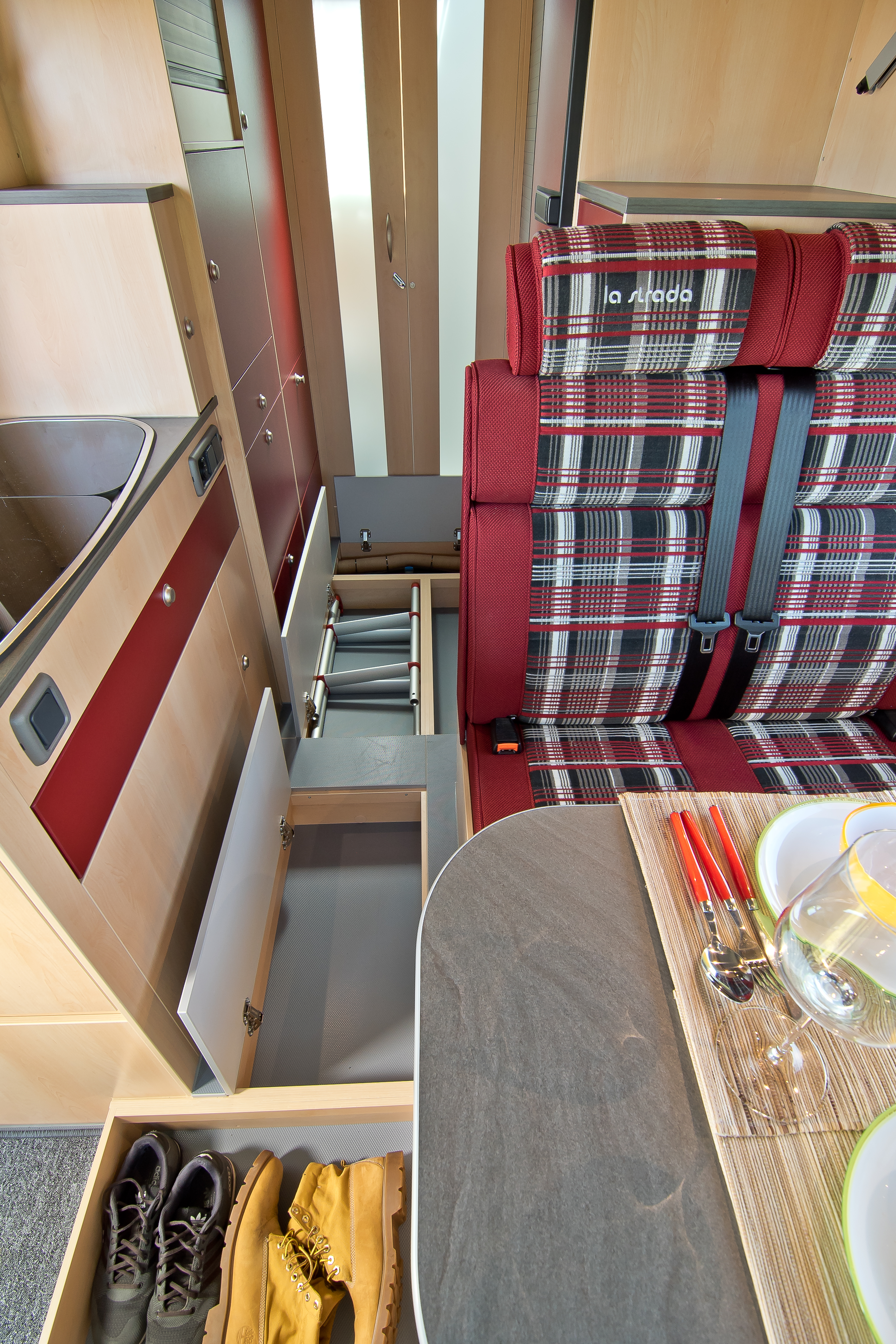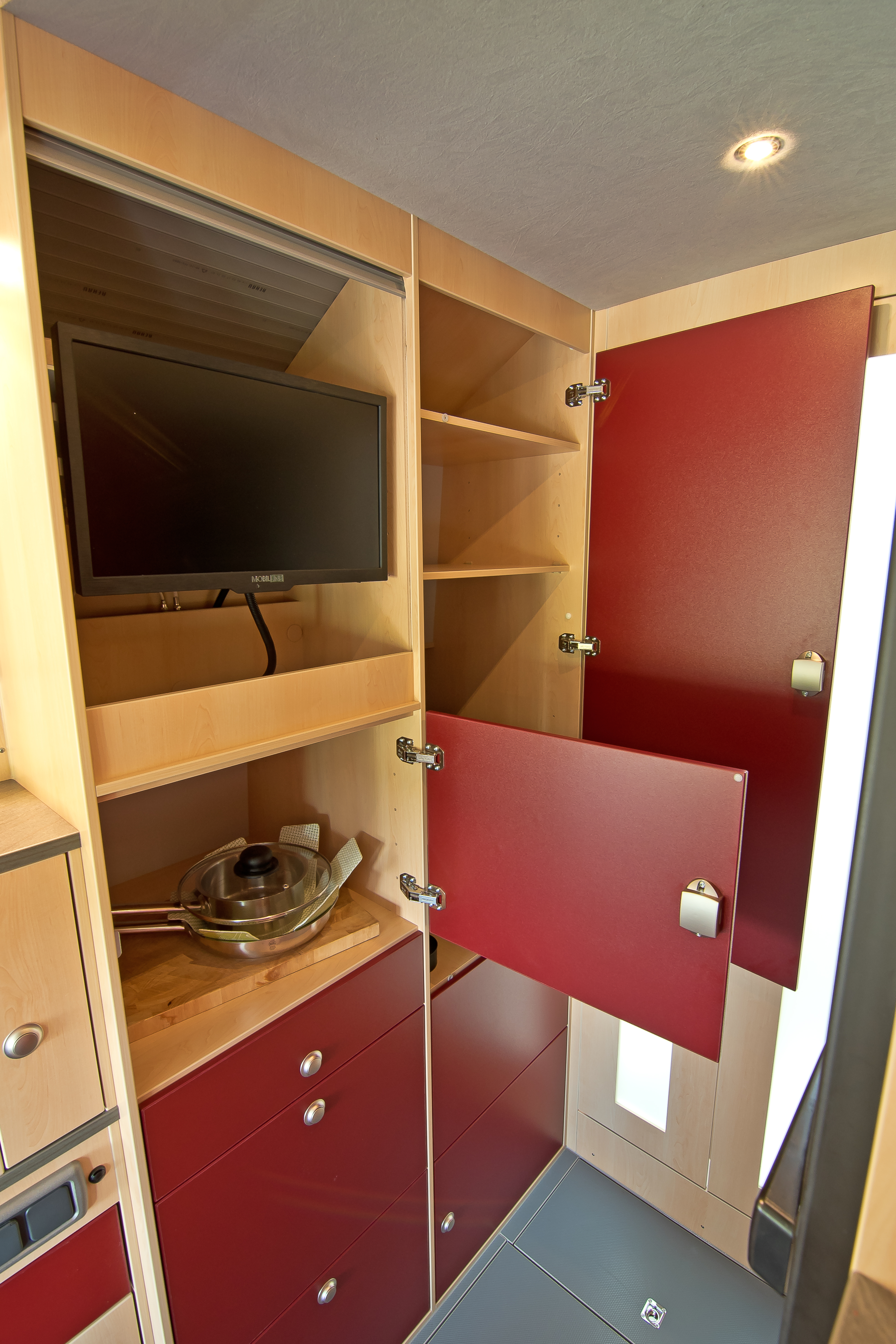 Ungewohnt ist der Blick auf den Küchenblock gegenüber der Sitzgruppe. Wo sonst die großen Auszüge für Töpfe und Pfannen angebracht sind, ist lediglich eine breite Schublade für Ess- und Kochbesteck. Die große Holzfläche darunter ist die Rückwand des Gaskastens. Dieser ist nun direkt hinter der Schiebetür unter dem Herd positioniert. So ist er leicht von außen zu erreichen und erleichtert den Wechsel der Gasflaschen. Ansonsten verfügt die Küche über einen Dreiflamm-Gaskocher mit elektrischer Zündung und eine Spüle in Edelstahl. Der Clou in der Küche sind zwei zusätzliche Arbeitsflächen. Eine wird bei Bedarf links am Küchenblock hochgeklappt, die andere rechts aus dem Stauschrank herausgezogen. Sogar für einen kleinen Apothekerauszug für Gewürze ist in der Küche noch Platz.