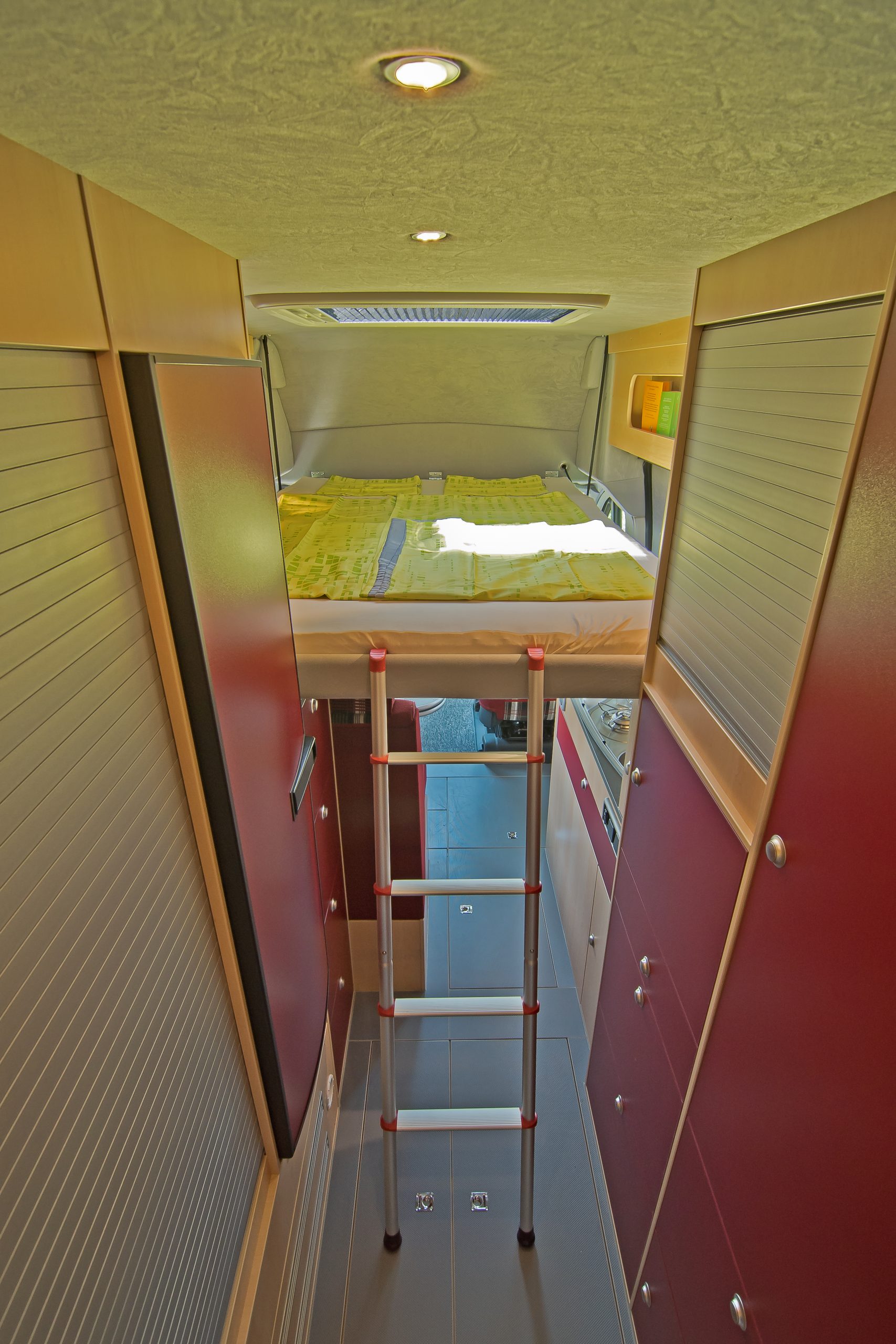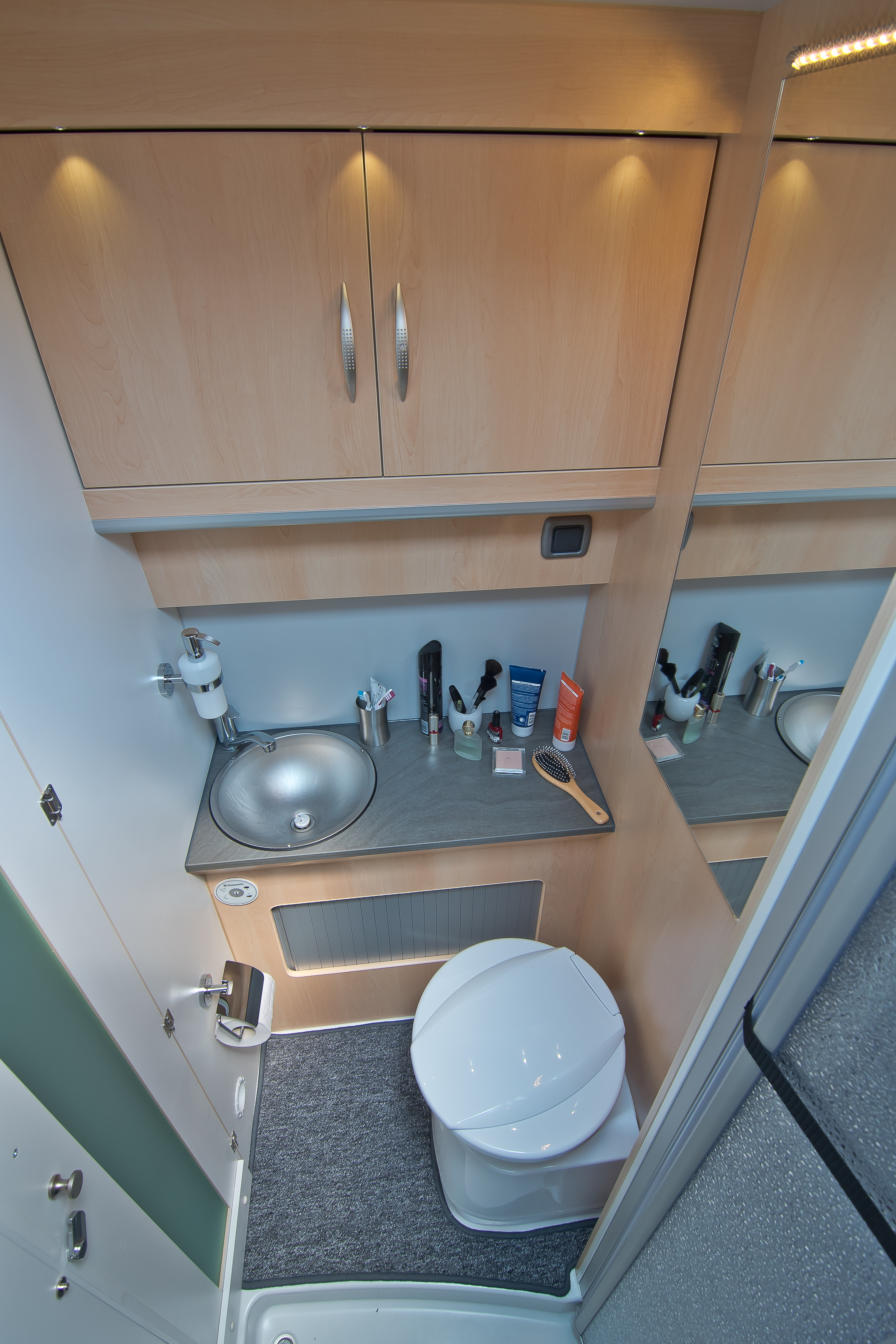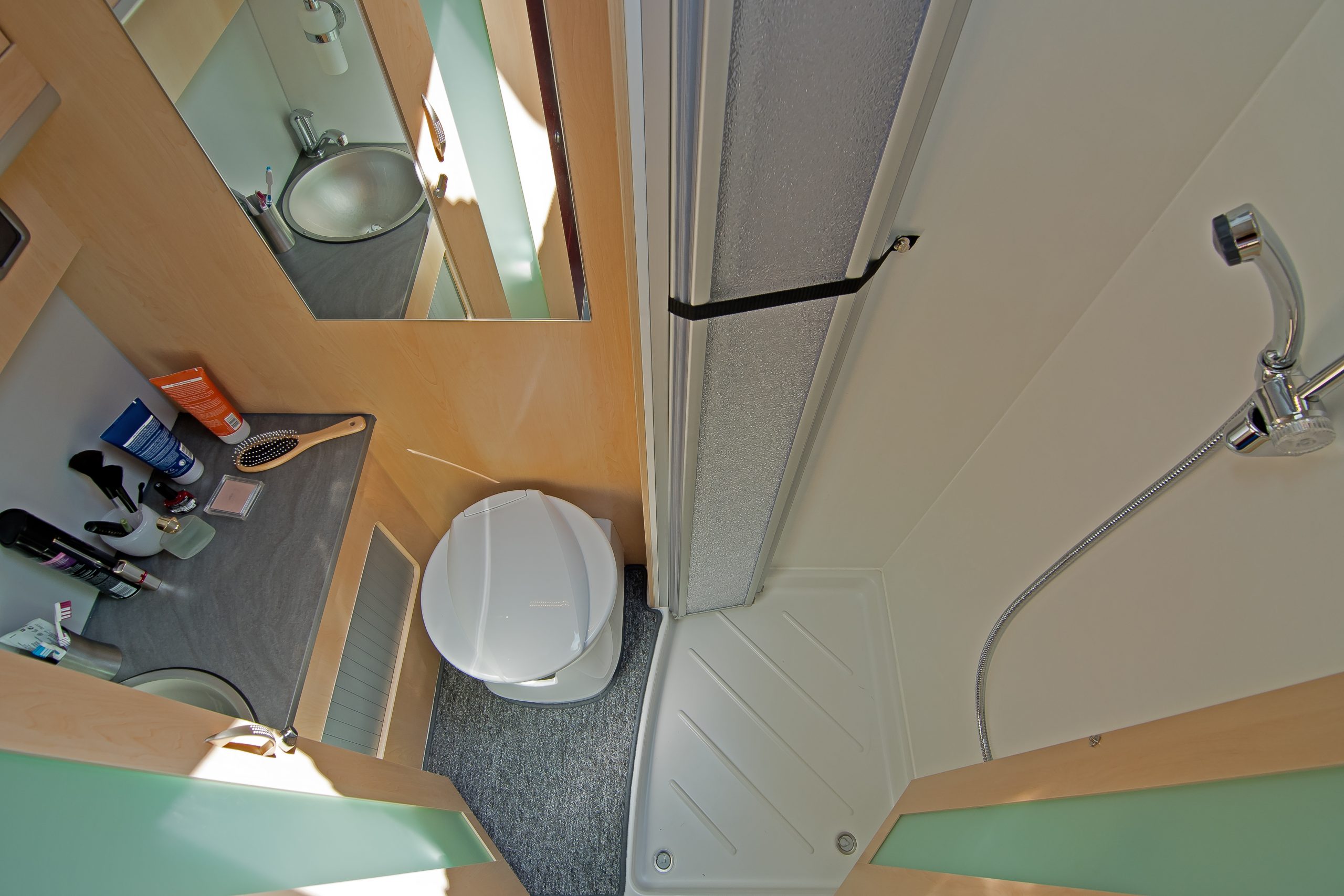Wohl kaum ein Kastenwagen-Reisemobil verfügt über ein so geräumiges Badezimmer wie der neue la strada Avanti H. Durch den Einbau quer im Heck kann das Bad die volle Fahrzeugbreite nutzen. Hinter den Flügeltüren gehört neben Toilette, Waschbecken und viel Stauraum für Hygieneartikel auch eine vollwertige Dusche zur Ausstattung des Bades. Erholsamen Schlaf finden die Reisenden in der oberen Etage des Avanti H. Dafür sorgen ein Froli Tellerfedersystem und eine 200 mal 130 Zentimeter große Kaltschaummatratze. Tagsüber ist das Bett unter die Decke geklappt und gibt so den Raum über der Sitzgruppe frei.