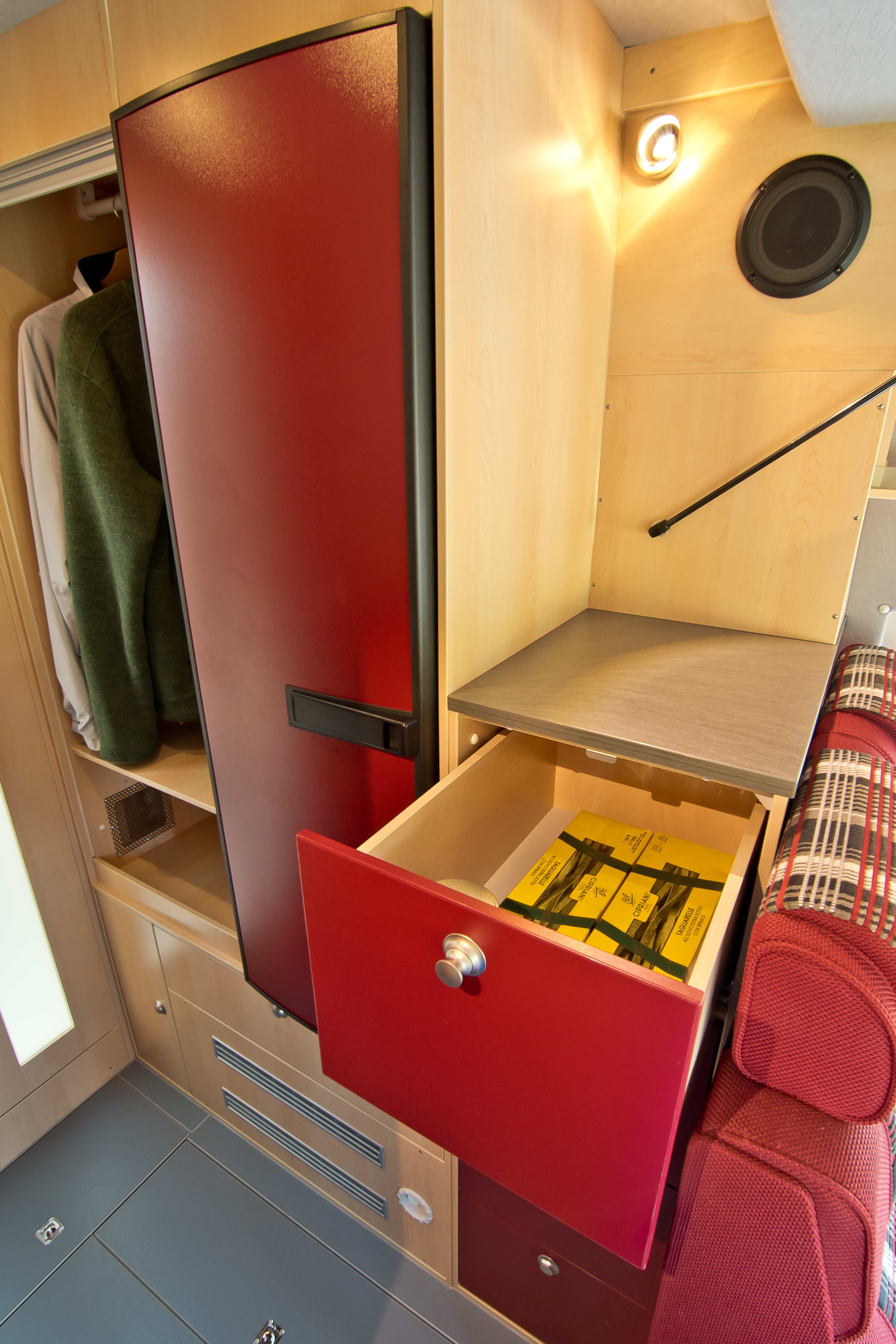 Im Avanti H ist reichlich Platz für Schränke. Links vor dem Bad ist ein großer Schrank für gefaltete Kleidung positioniert. Darunter befinden sich noch zwei große Auszüge. Rechts steht ein Schrank für Kleidung auf Bügeln, der wahlweise auch mit Einlegeböden für gefaltete Kleidung bestückt werden kann. Auf der Beifahrerseite kommen nun die Schränke, Staufächer und Auszüge für die sperrigen Küchenutensilien sowie für den optionalen Fernseher. Gegenüber wartet in rückenfreundlicher Höhe ein großer Kühlschrank im Slim Tower Design darauf, mit reichlich Leckereien aus fernen Ländern gefüllt zu werden. Maximal 138 Liter Kühlvolumen gilt es zu füllen, wenn das herausnehmbare 10 Liter Tiefkühlfach entfernt wird. Beachtlich für einen Kastenwagen. Vor dem Kühlschrank steht nochmals eine Reihe mit vier großen Auszügen. Und damit nicht genug. Weiteren Stauraum bieten die Fächer des Doppelbodens, die sich in verschiedenen Größen über die gesamte Länge des Wohnraumbodens vom Fahrerhaus bis zum Heckbad befinden.