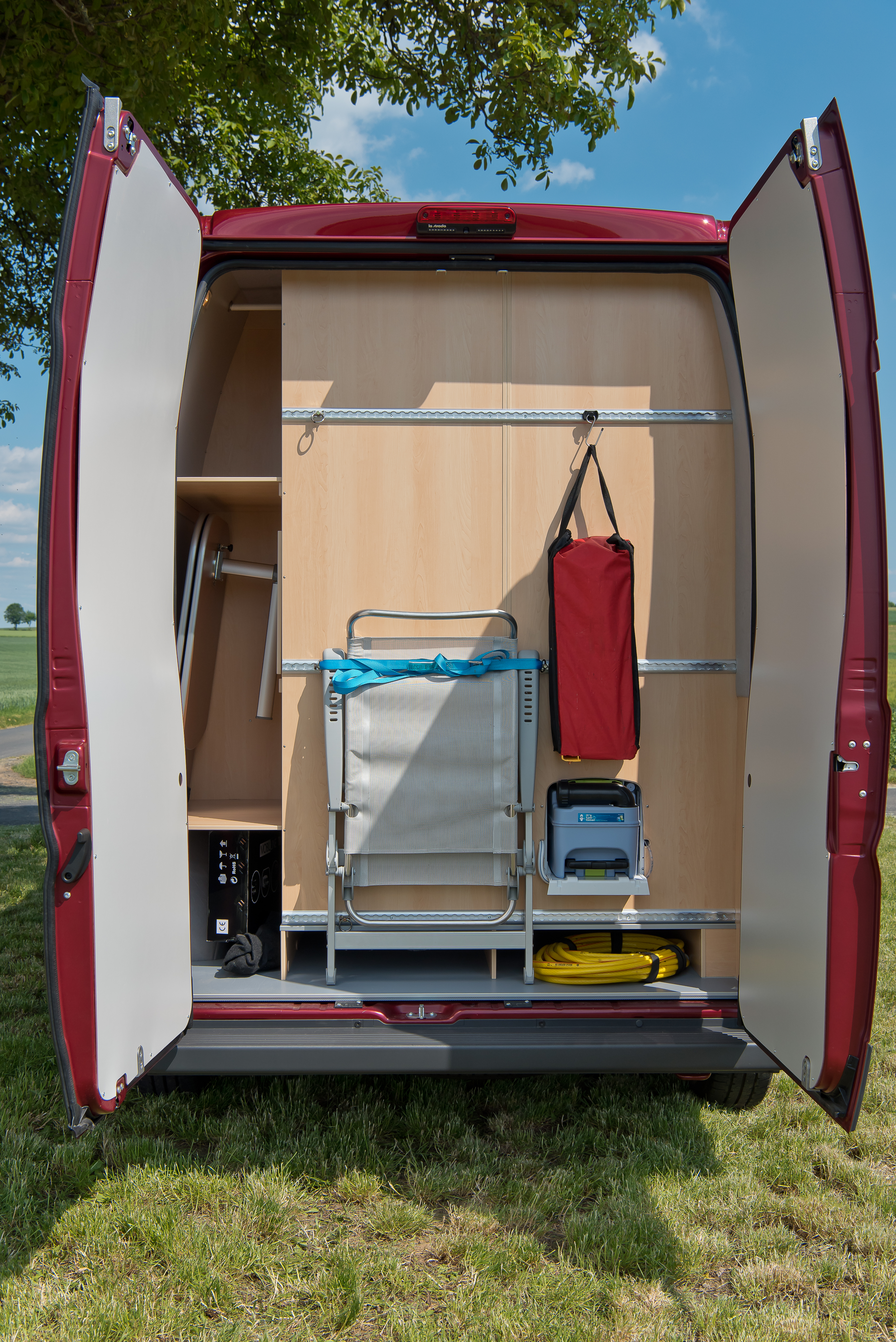 Der Heckstauraum fällt, bedingt durch den Grundriss des Bades, nicht so groß aus wie bei andern Avanti Modellen. Dennoch ist es den la strada Entwicklern gelungen, auch hier noch Staumöglichkeiten unterzubringen. Links entstehen durch klappbare Zwischenböden mehrere variable Staufächer. Hier kann bei Bedarf auch der Tisch während der Fahrt Platz finden. Im Doppelboden unter dem Bad finden problemlos kleinere Campingmöbel, Wasserschlauch, Ausgleichkeile oder Werkzeug Platz. Wer die rund 20 Zentimeter zwischen Rückwand des Bades und den Hecktüren vertikal voll ausnutzen möchte, bestellt das optionale Verzurrsystem für die Rückwand des Bades.