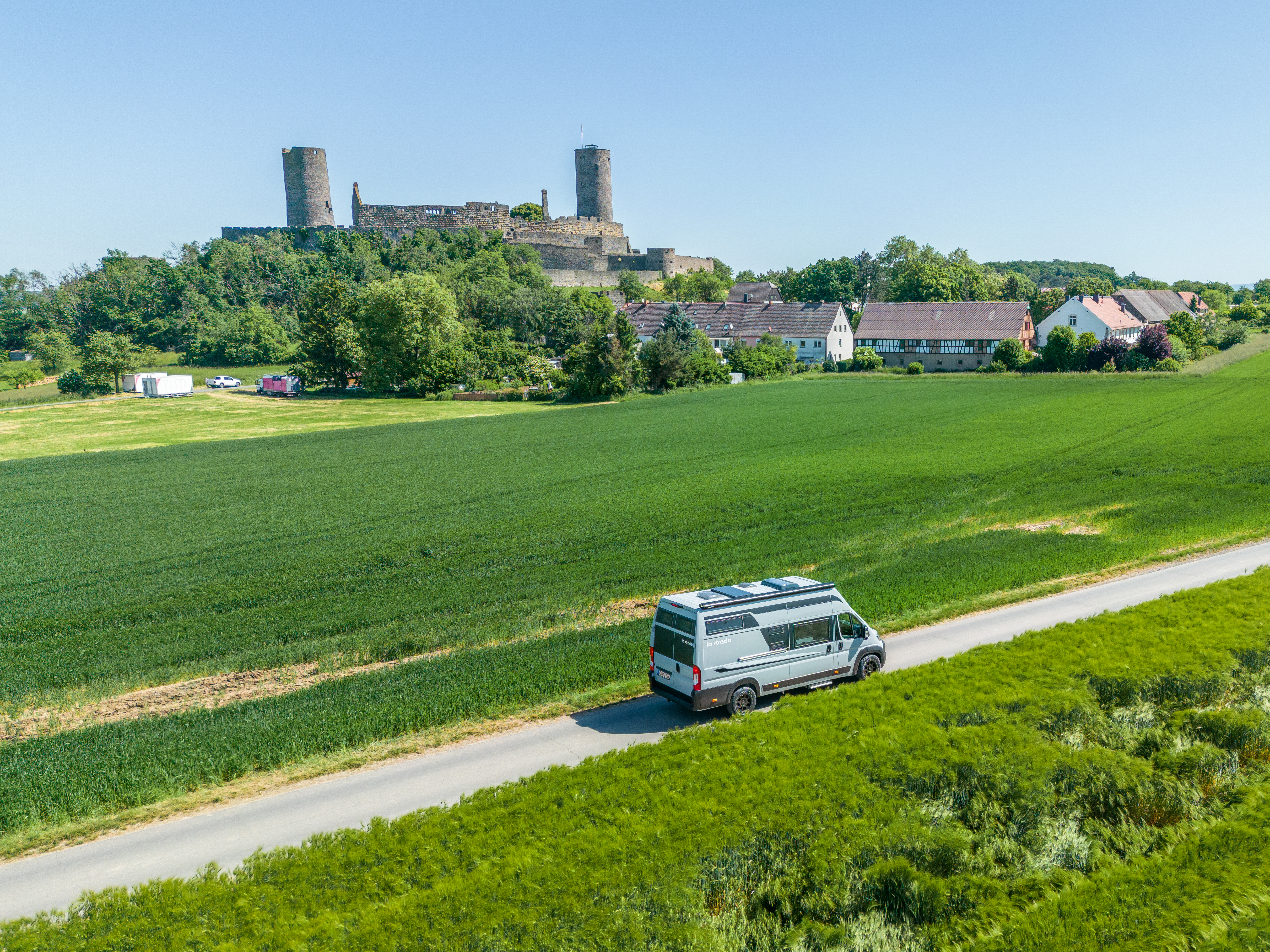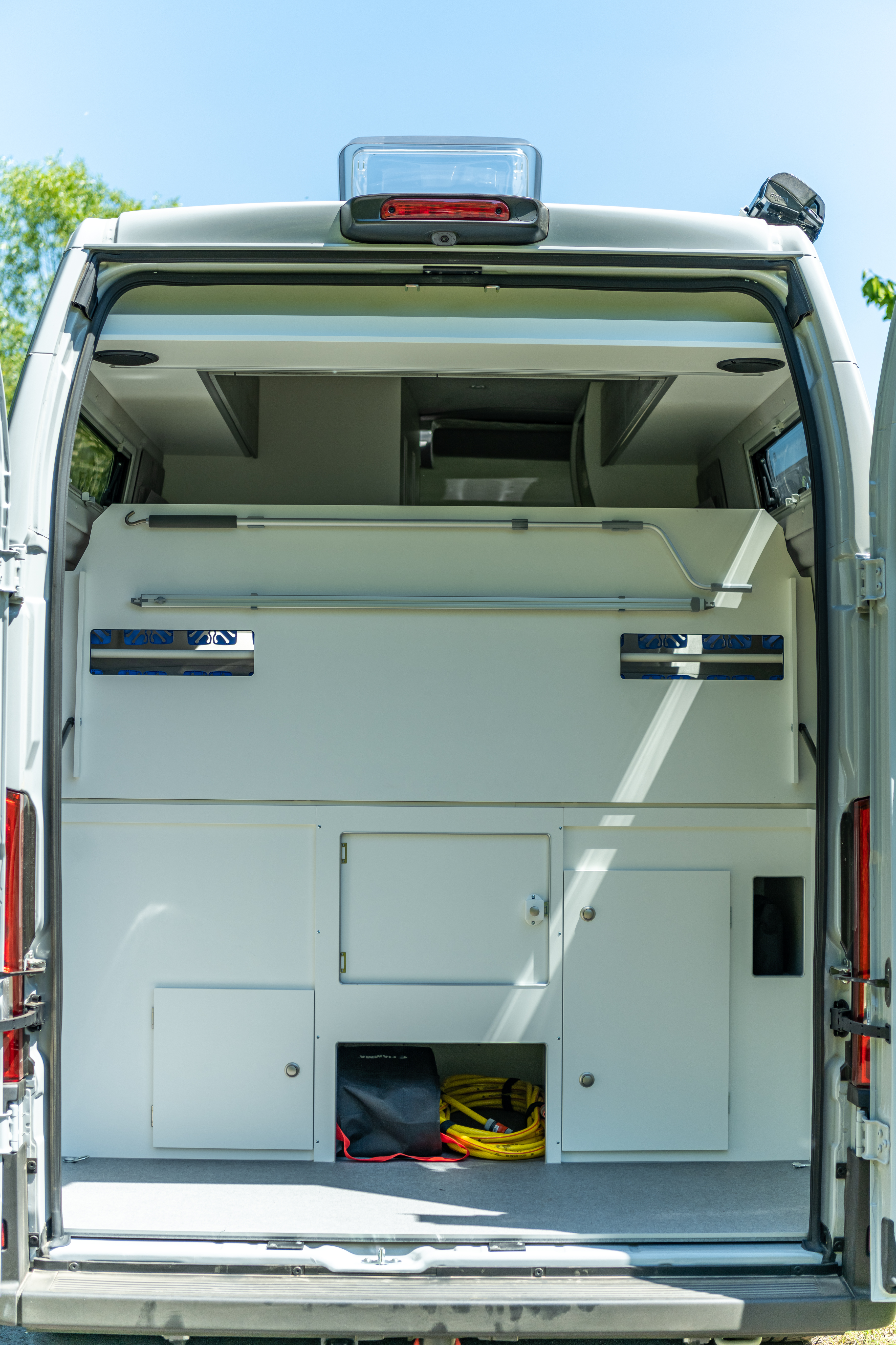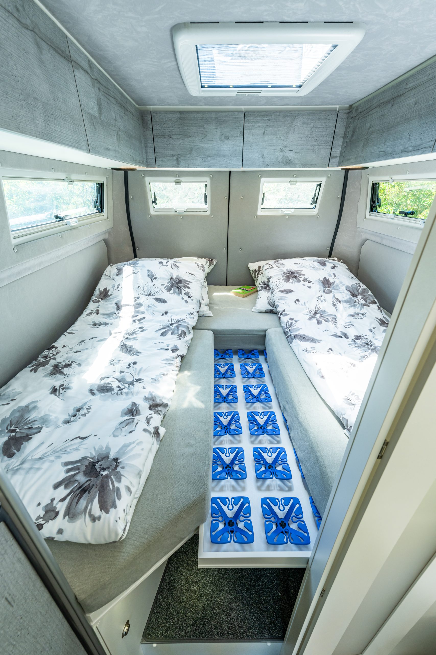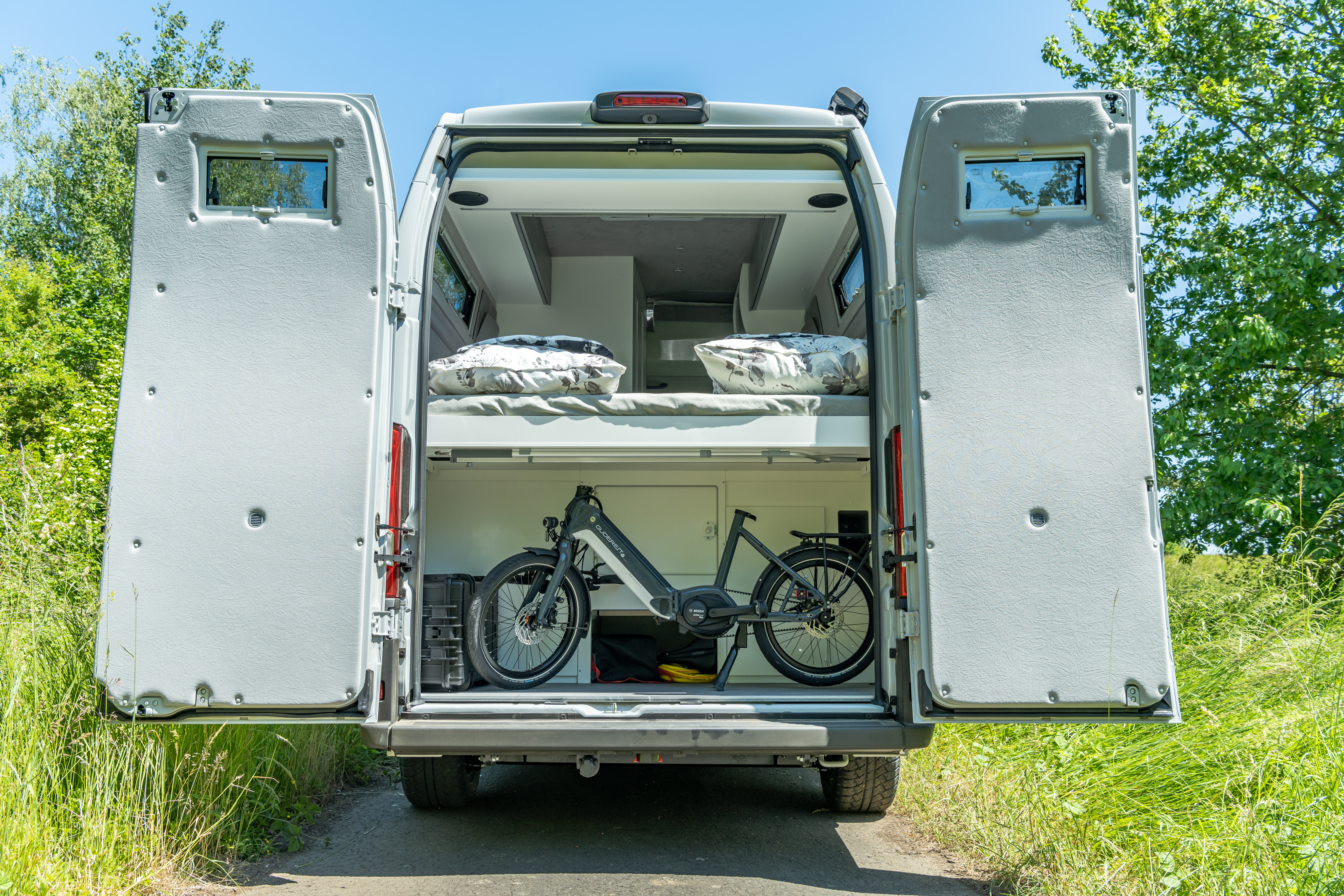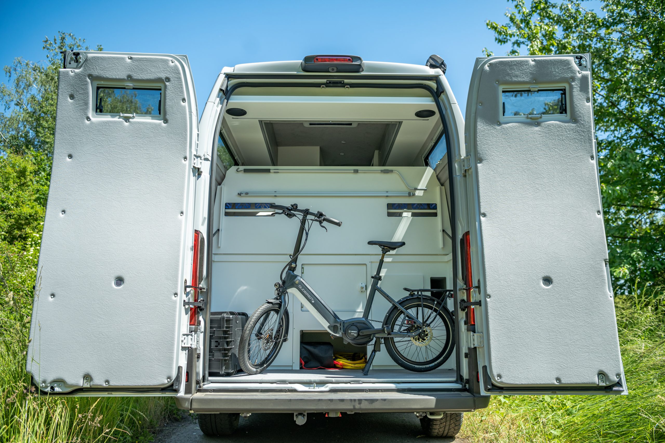 Durch einen Umbau am Bett entsteht eine Heckgarage: Der hintere Teil des Heckbettes lässt sich dafür über die gesamte Fahrzeugbreite hochklappen. So entsteht ein üppiger Heckstauraum bis unter die Decke des Reisemobils. Hier passen auch zwei normal große Fahrräder quer hinein. Dennoch bleibt auf der vorderen Hälfte der Betten ein bequemer Schlafplatz für eine Person erhalten.