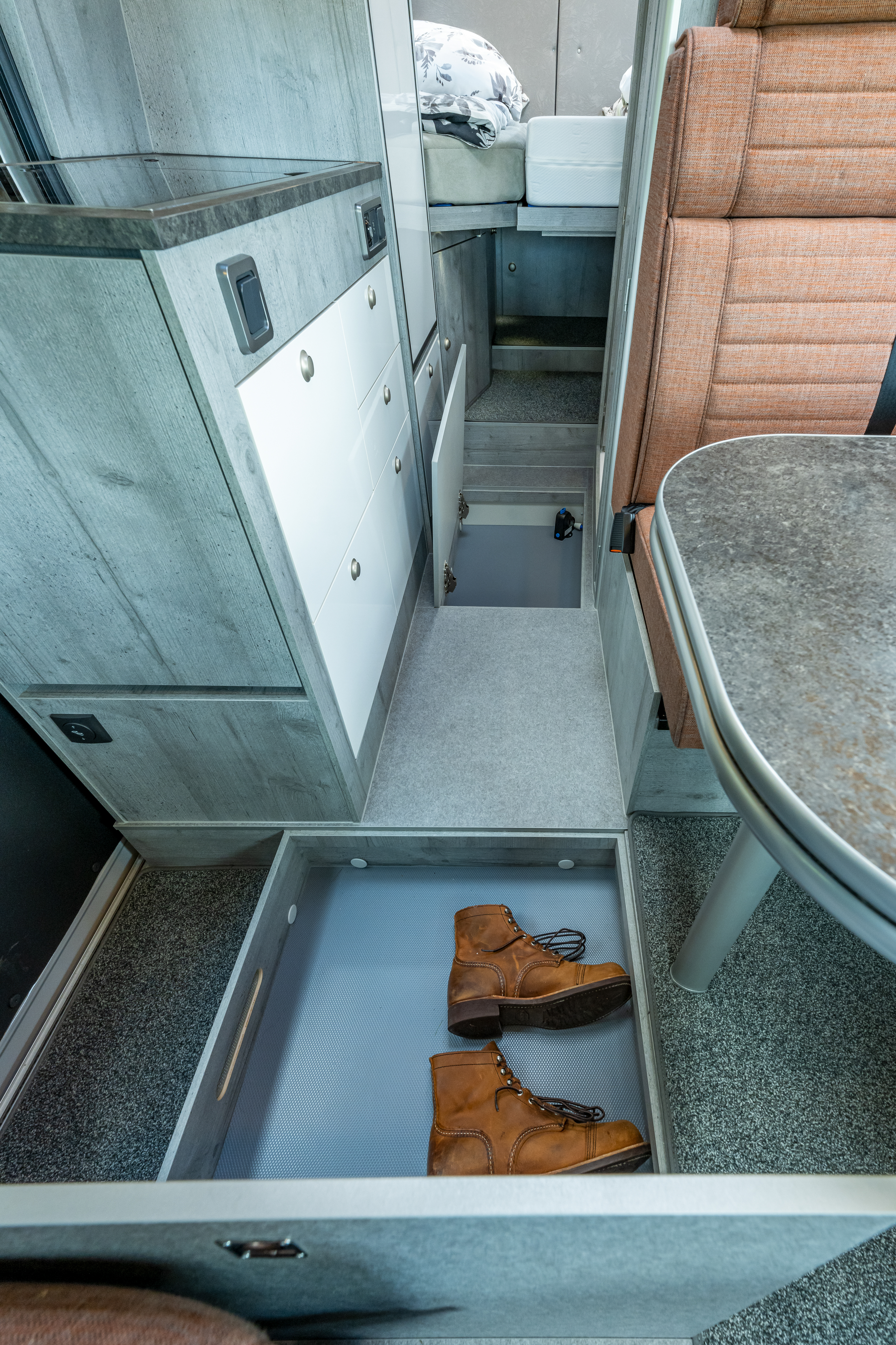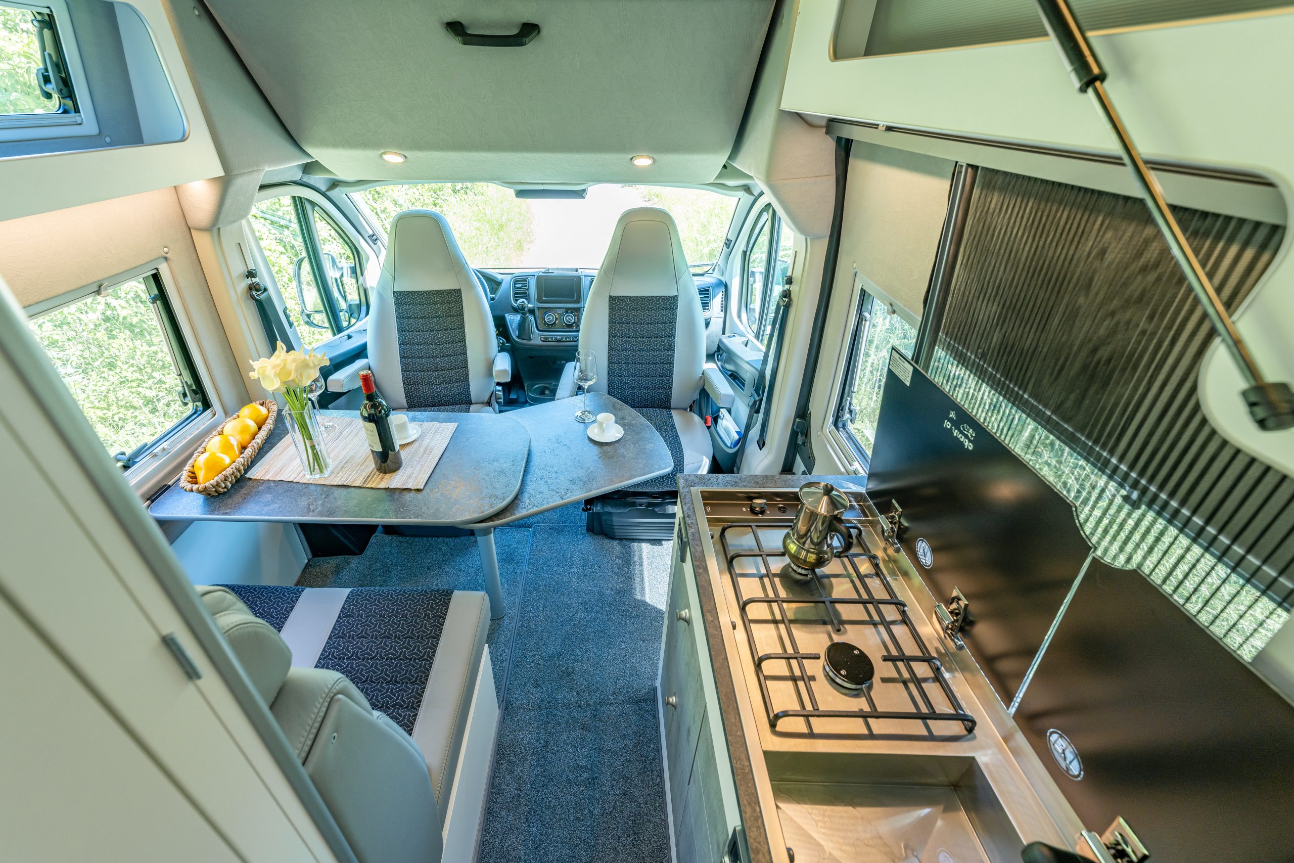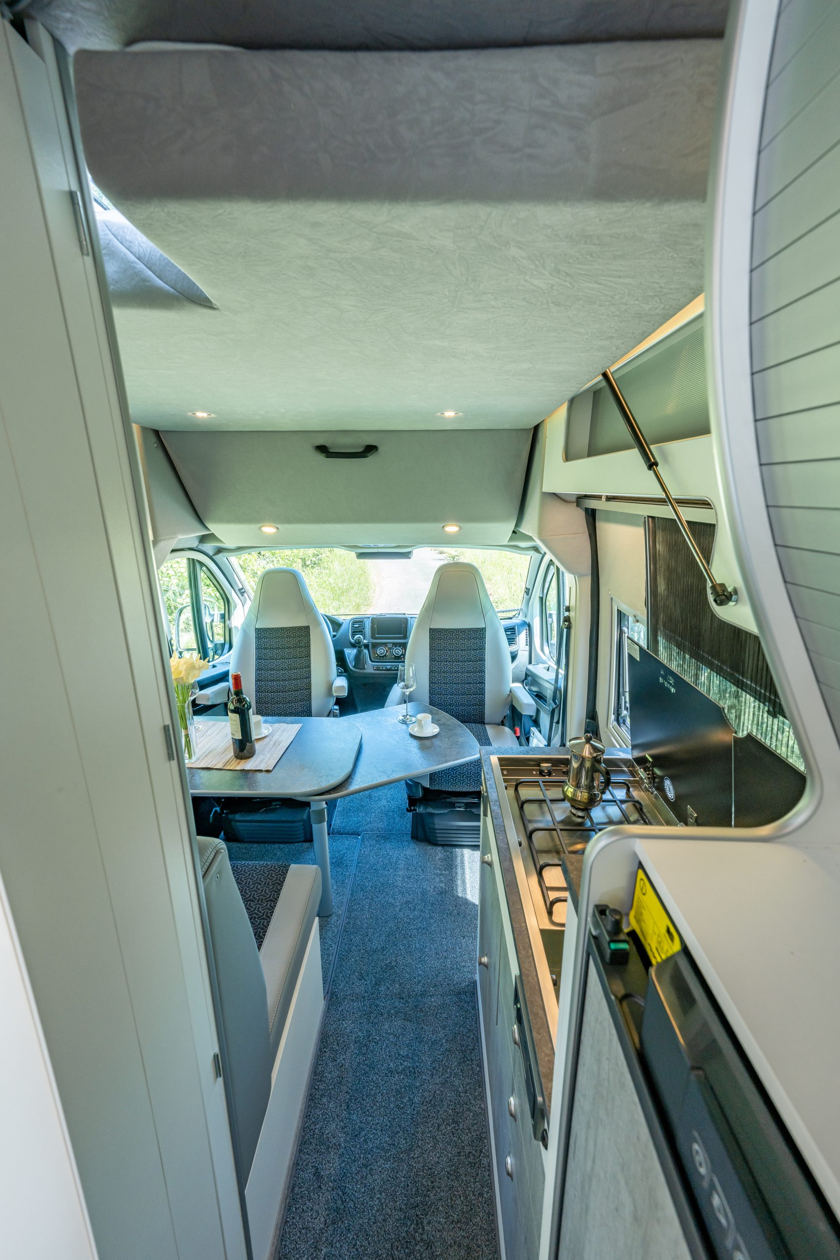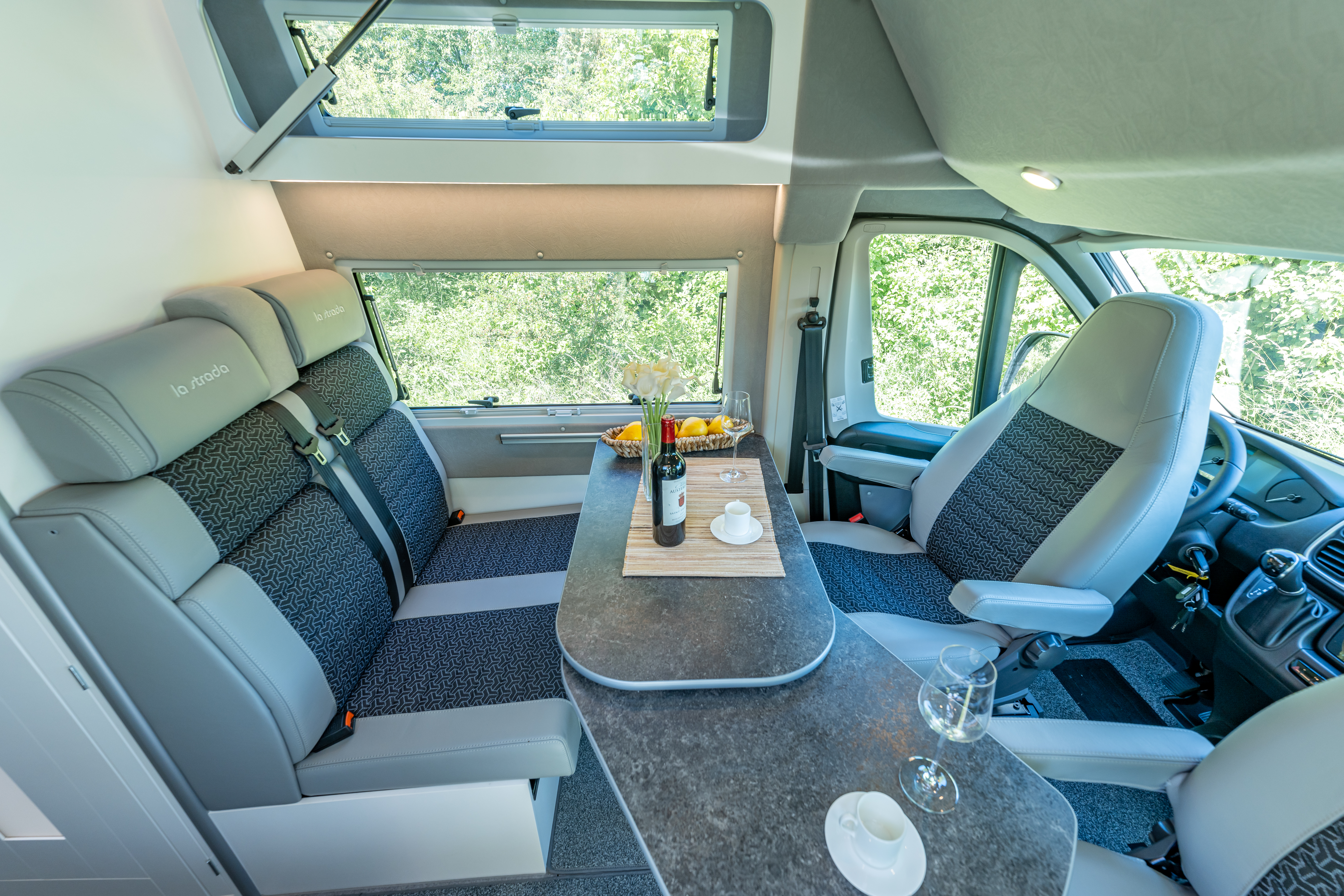 Im vorderen Fahrzeugteil befindet sich die Sitzgruppe, die aus einer und den drehbaren Fahrerhaussitzen besteht. Die Sitzbank ist mit zwei Drei-Punkt-Gurten ausgestattet und lässt sich in verschiedene Sitzpositionen verstellen. Der Fensterplatz verfügt über eine Isofix-Halterung mit Top-Tether für Kindersitze. Ein großer Tisch ist an der Seitenwand befestigt. Er stützt sich in der Fahrzeugmitte auf einen Standfuß und lässt sich zum Beifahrersitz hin mit einer ausschwenkbaren Platte vergrößern. So können auch um den Tisch bis zu vier Personen gemütlich essen oder spielen.