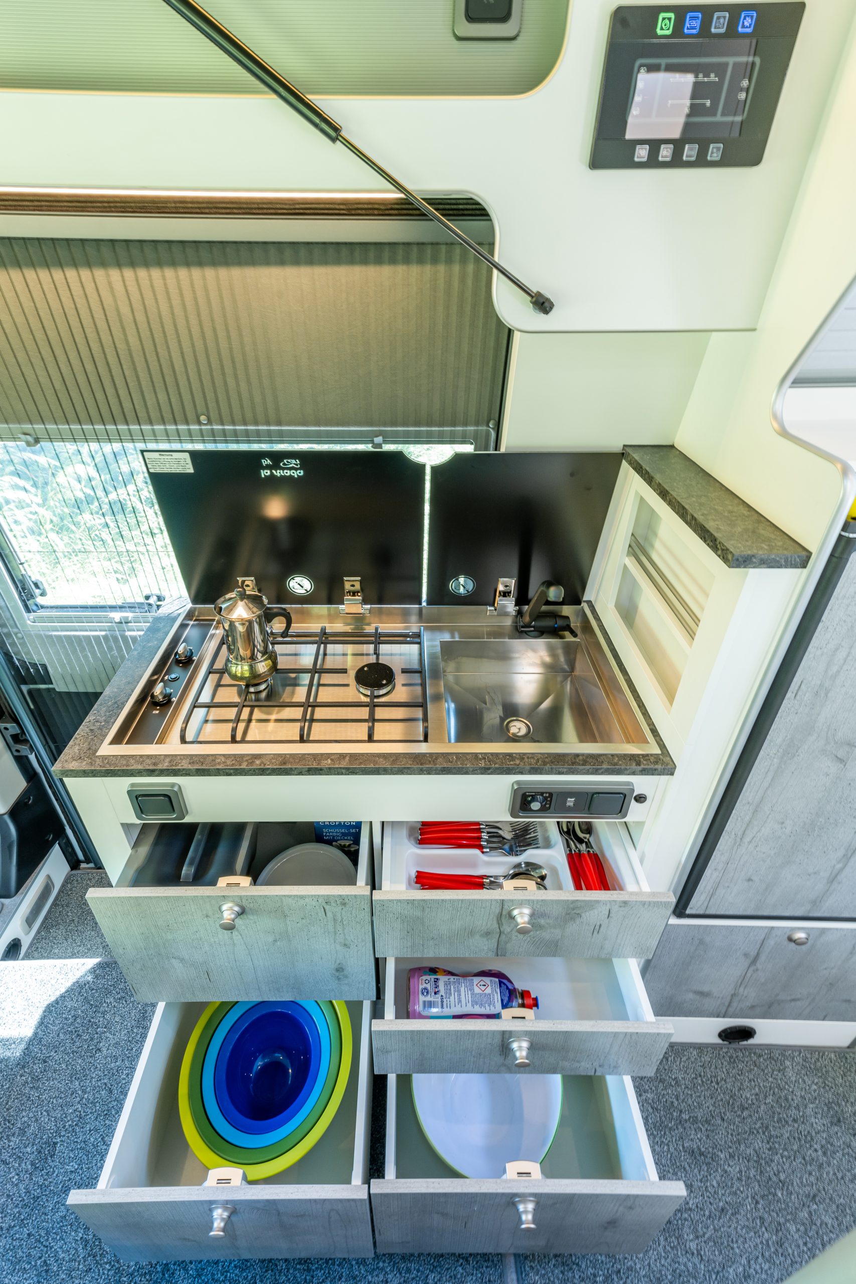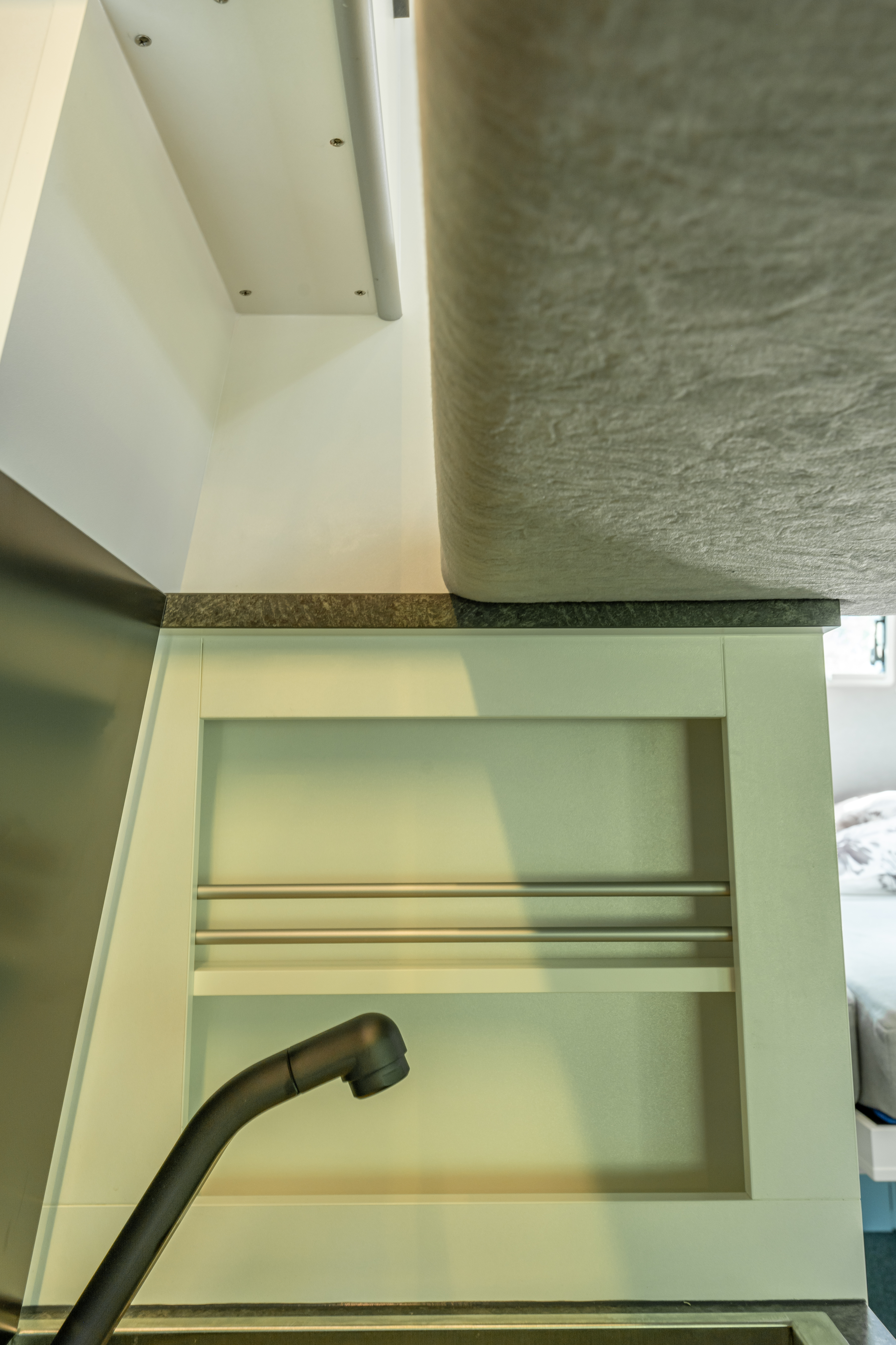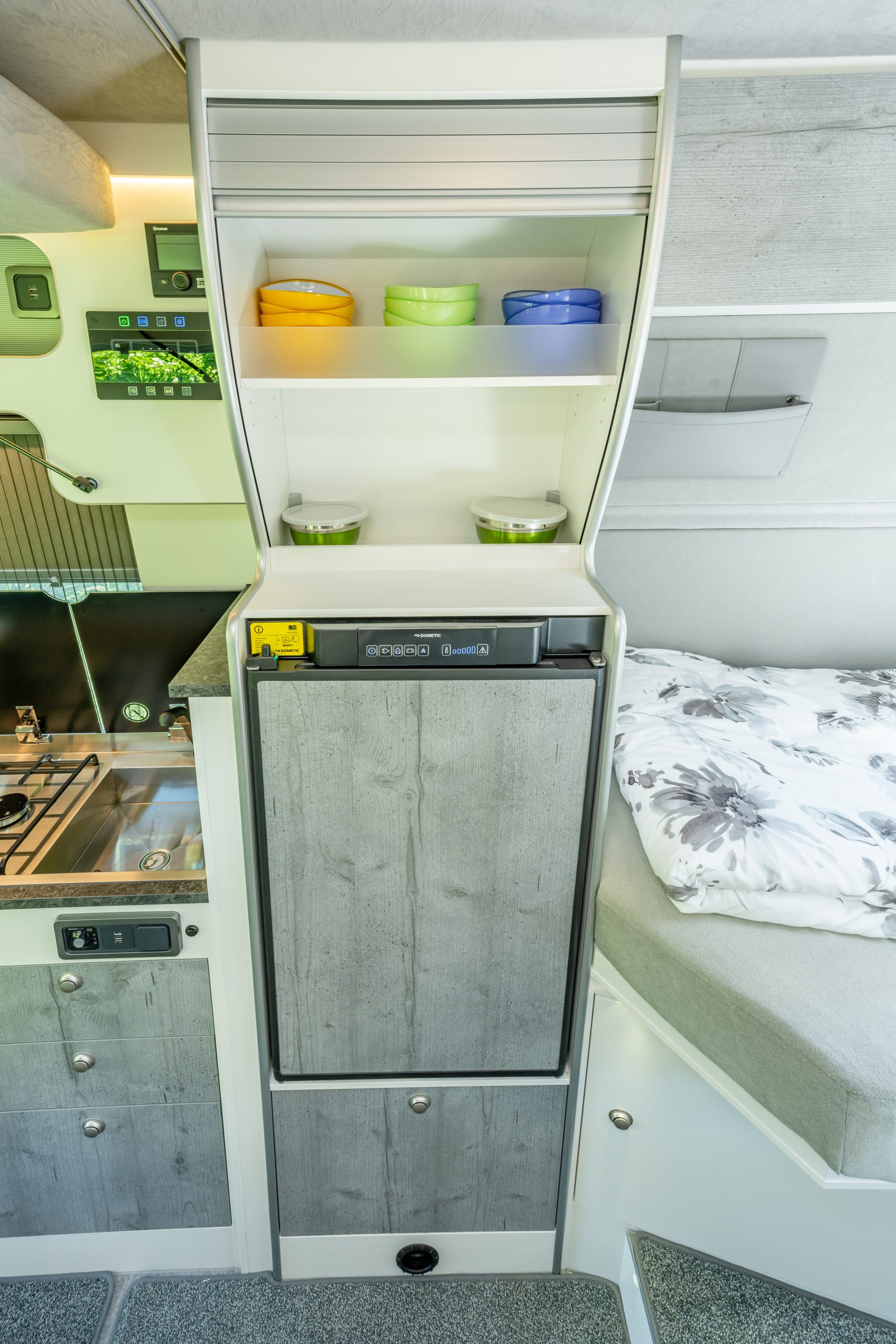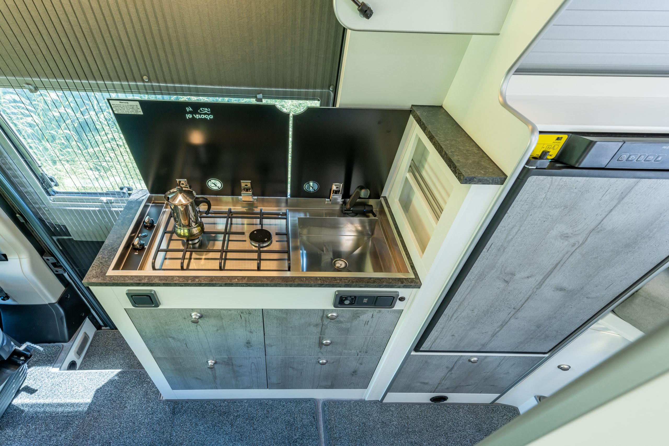 Gegenüber des Bades auf der Beifahrerseite findet der Küchenblock Platz. Er verfügt über einen Zwei-Flamm-Kocher mit Piezo-Zündung und eine solide gusseiserne Topfauflage. Der Kocher und die geräumige Spüle sind in einer durchgängigen Form in Edelstahl ausgeführt und dadurch leicht zu reinigen. Rechts daneben befindet sich in griffgünstiger Höhe ein 80 Liter Absorber-Kühlschrank mit automatischer Energiewahl. Über und unter dem Kühlschrank gibt es Schränke teils mit Rollos, teils als Auszüge. Geräumige Auszüge unter Herd und Spüle schaffen leichten Zugang zu den Kochutensilien. Eine ausklappbare Arbeitsplatte erweitert bei Bedarf den Aktionsradius in der Küche.