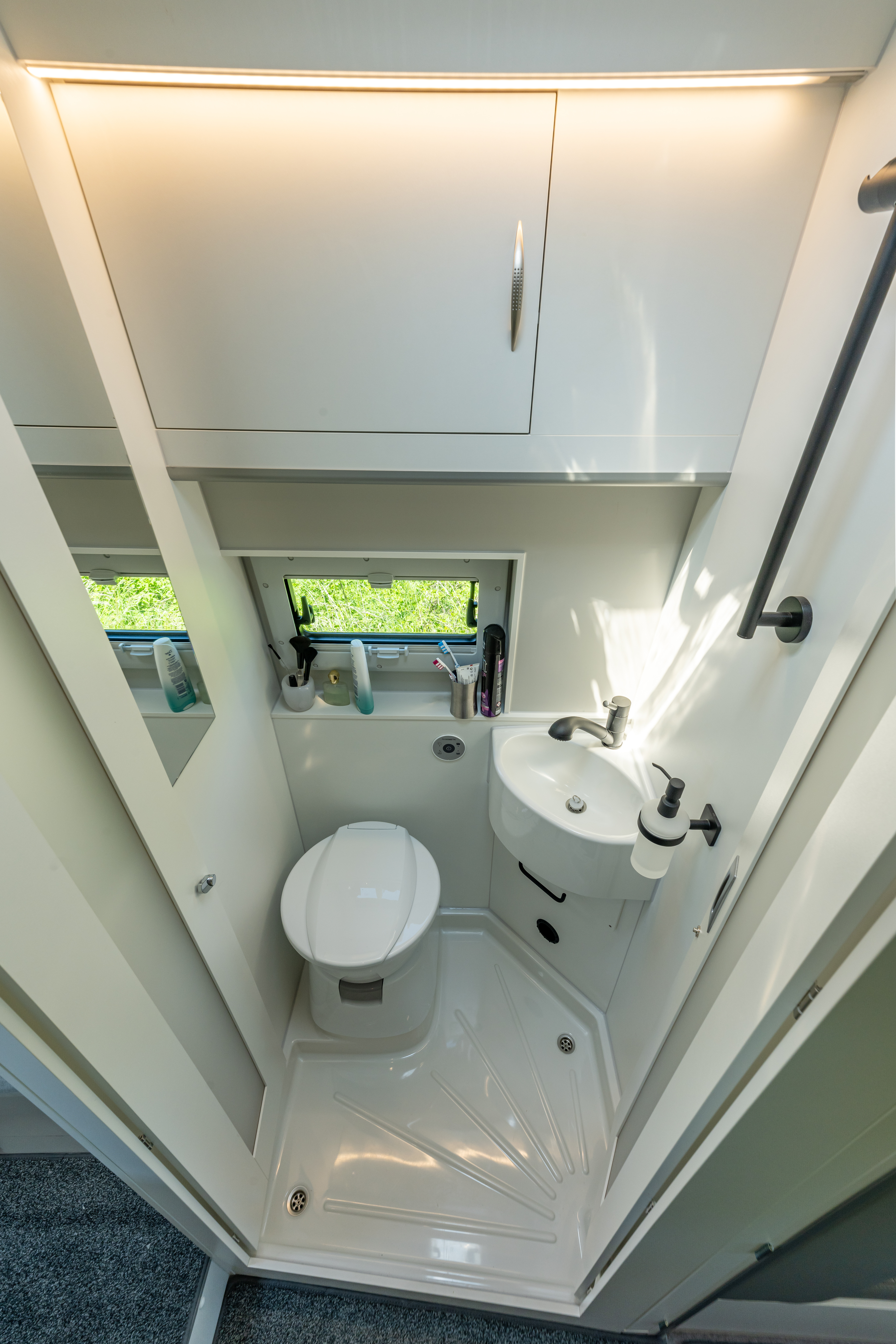 Vor den Einzelbetten verbirgt sich auf der Fahrerseite das Bad hinter zwei platzsparenden Flügeltüren. Toilette, Waschbecken und Oberschrank stehen für die tägliche Hygiene bereit. Die Handbrause des Waschbeckens lässt sich herausziehen und an einer Duschstange befestigen. Durch die geöffneten Flügeltüren entsteht mehr Bewegungsfreiheit im Heck. Bei Bedarf trennt zudem ein Vorhang den Wohnraum und das Hubbett vom Schlafbereich im Heck.