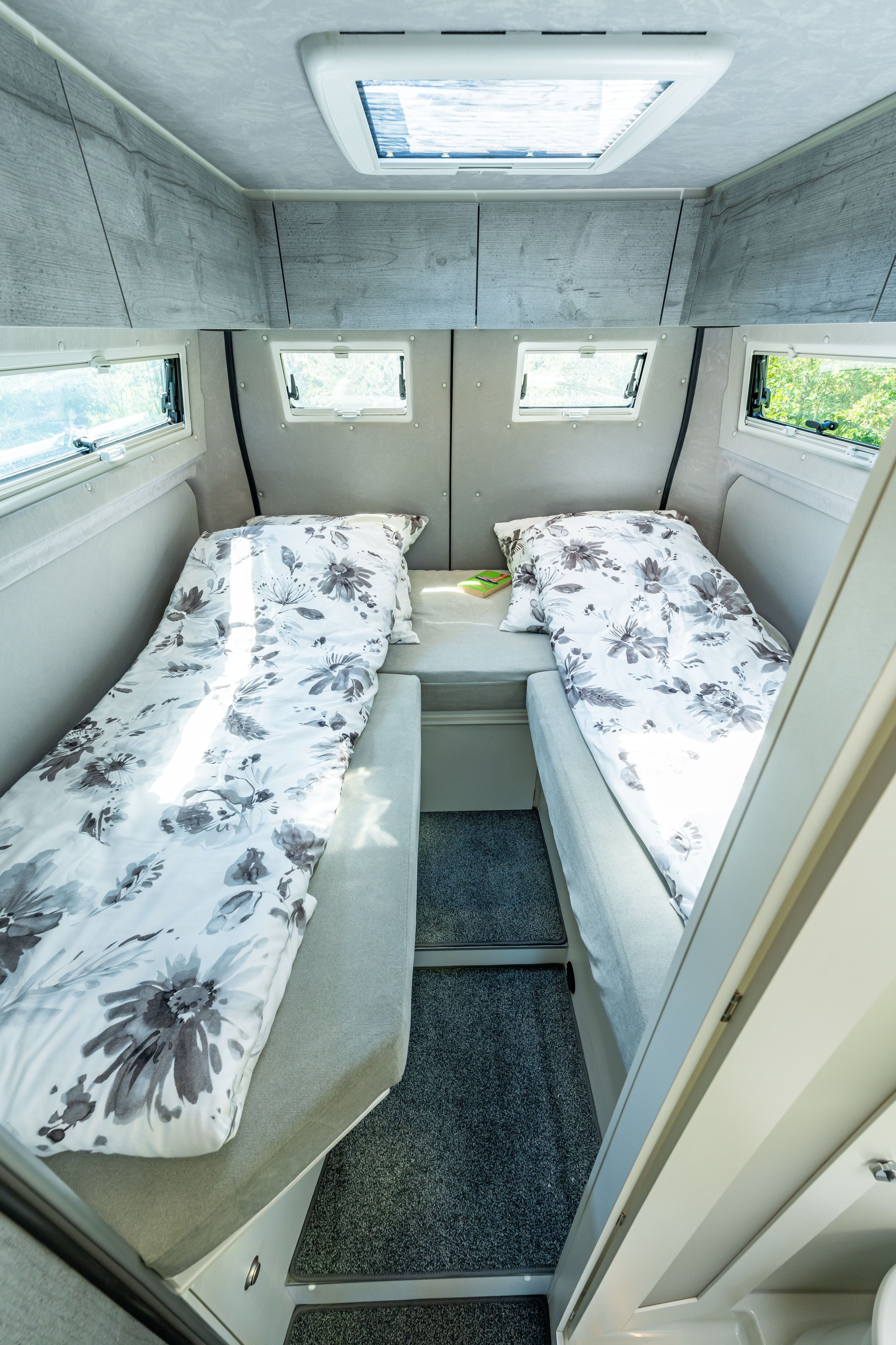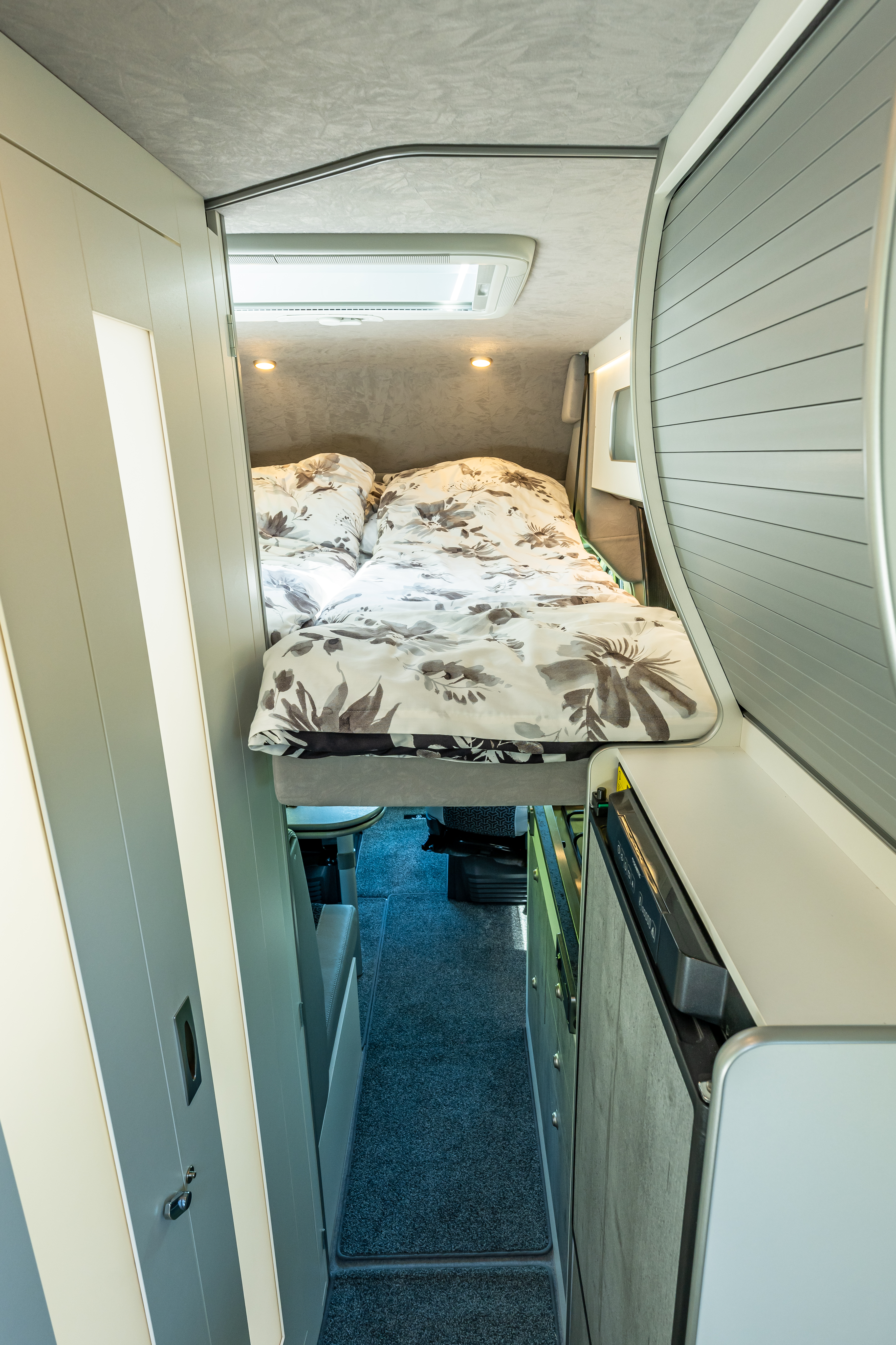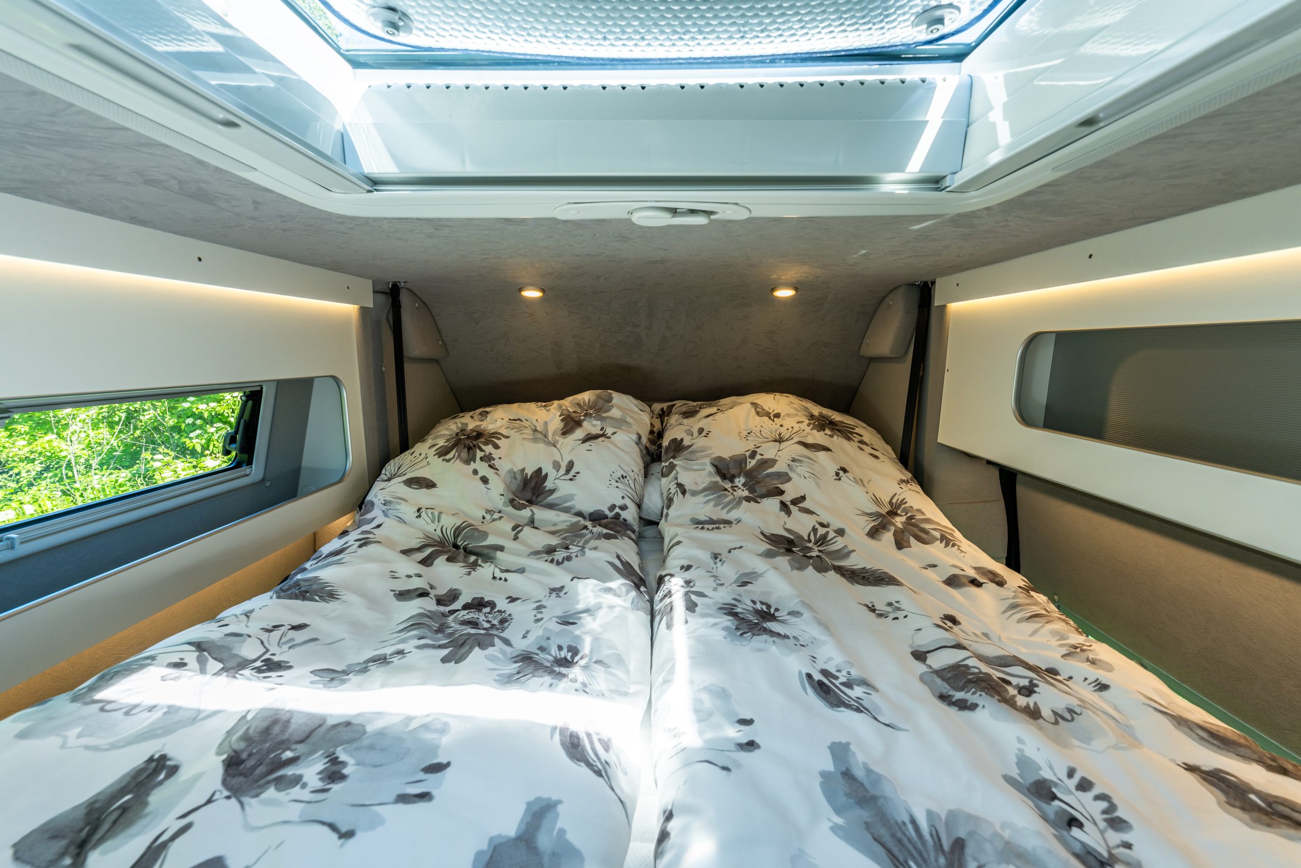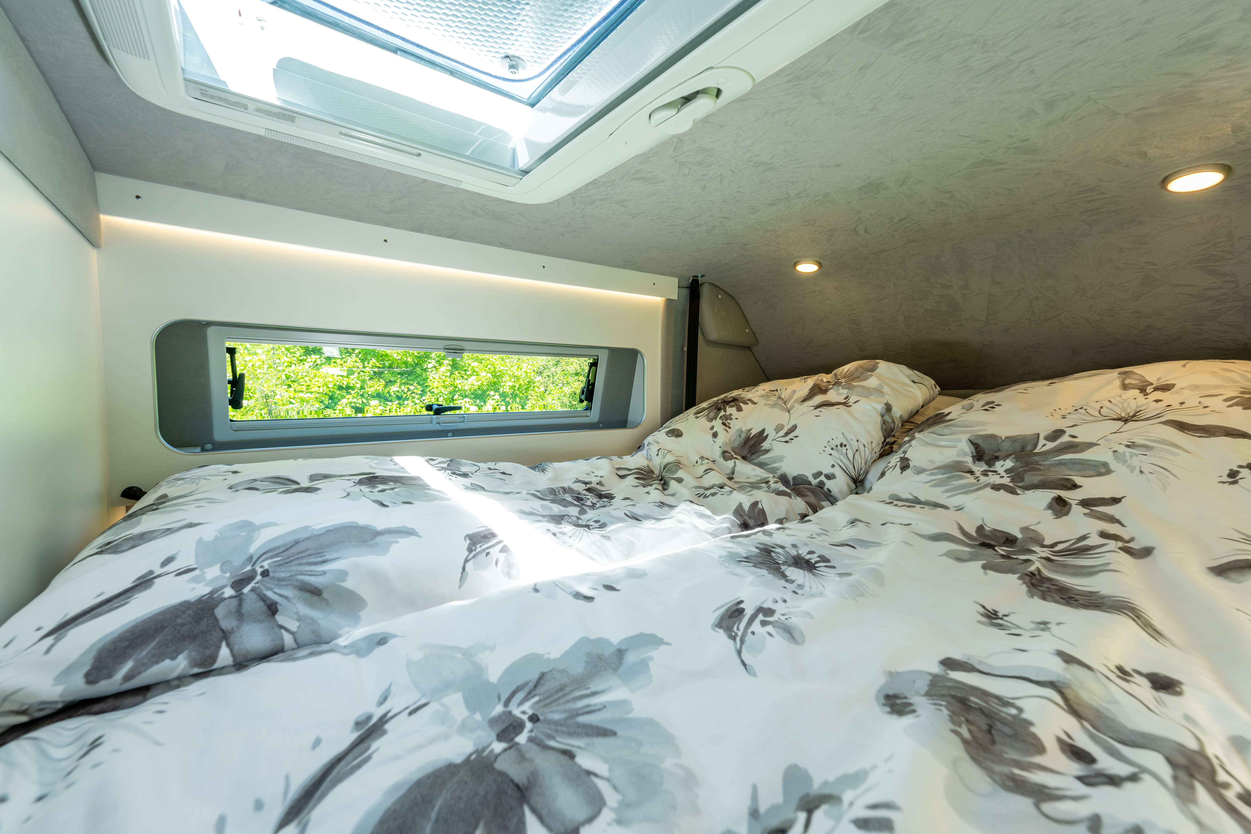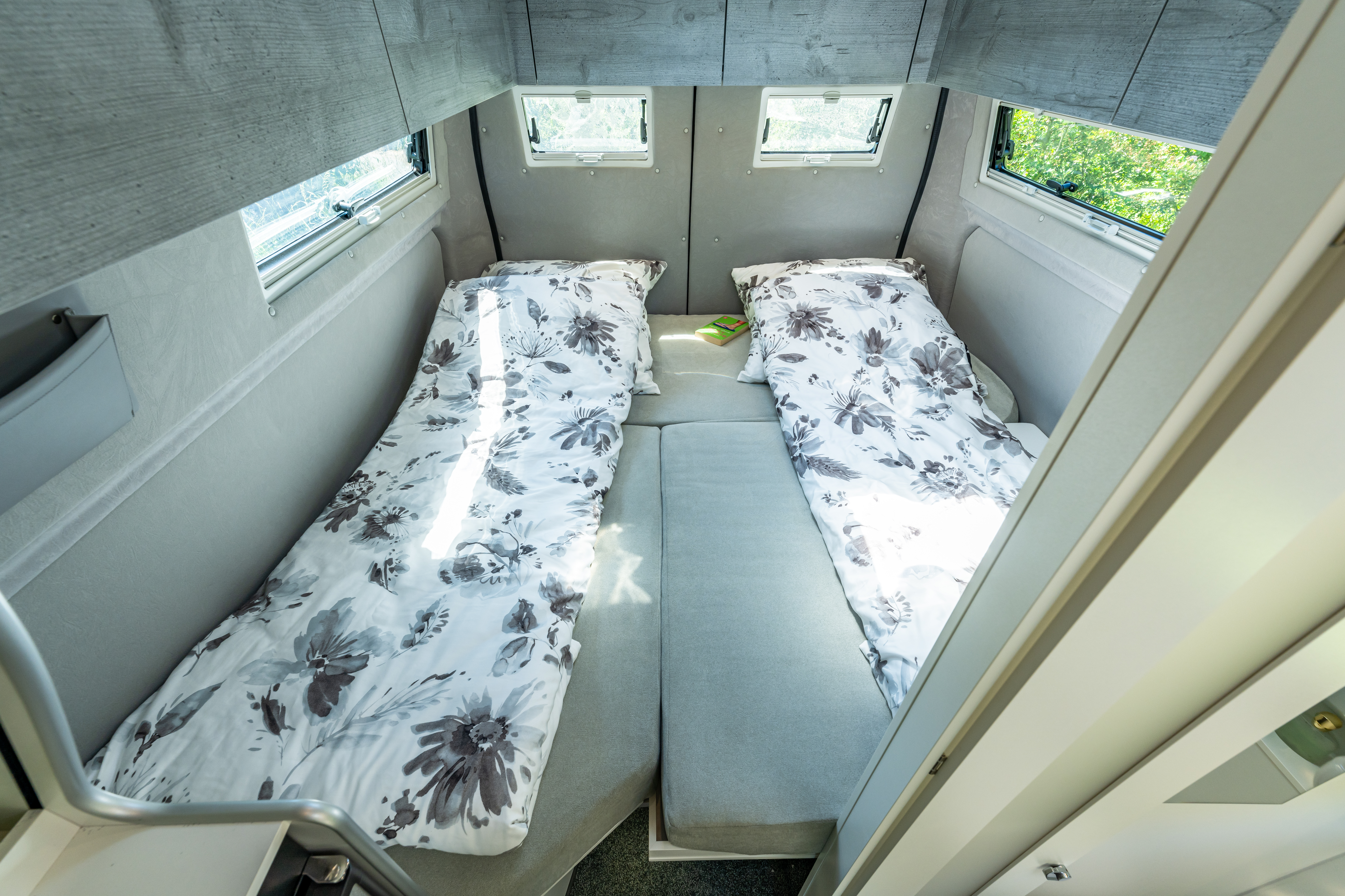 Das Hubbett im Vorderteil des Reisemobils senkt sich an zwei Gasfedern auf die an den Möbeln montierten soliden Stützen. Hier liegt es ohne Ruckeln und Wackeln sicher auf. Am Fußende ist das Hubbett auf der Fahrerseite 1,75 Meter und auf der Beifahrerseite 2,00 Meter lang. Die durchgängige Breite beträgt 130 Zentimeter. An der Decke über dem Hubbett sind am Kopfende zwei LED Leselampen angebracht. Zudem sorgt ein Dachfenster sowie ein optionales Seitenfenster für Licht und Luftzufuhr. Zwei beleuchtete Ablagen links und rechts neben dem Hubbett sind praktisch für Bücher, Lesebrillen, Mobiltelefone oder Tablets.