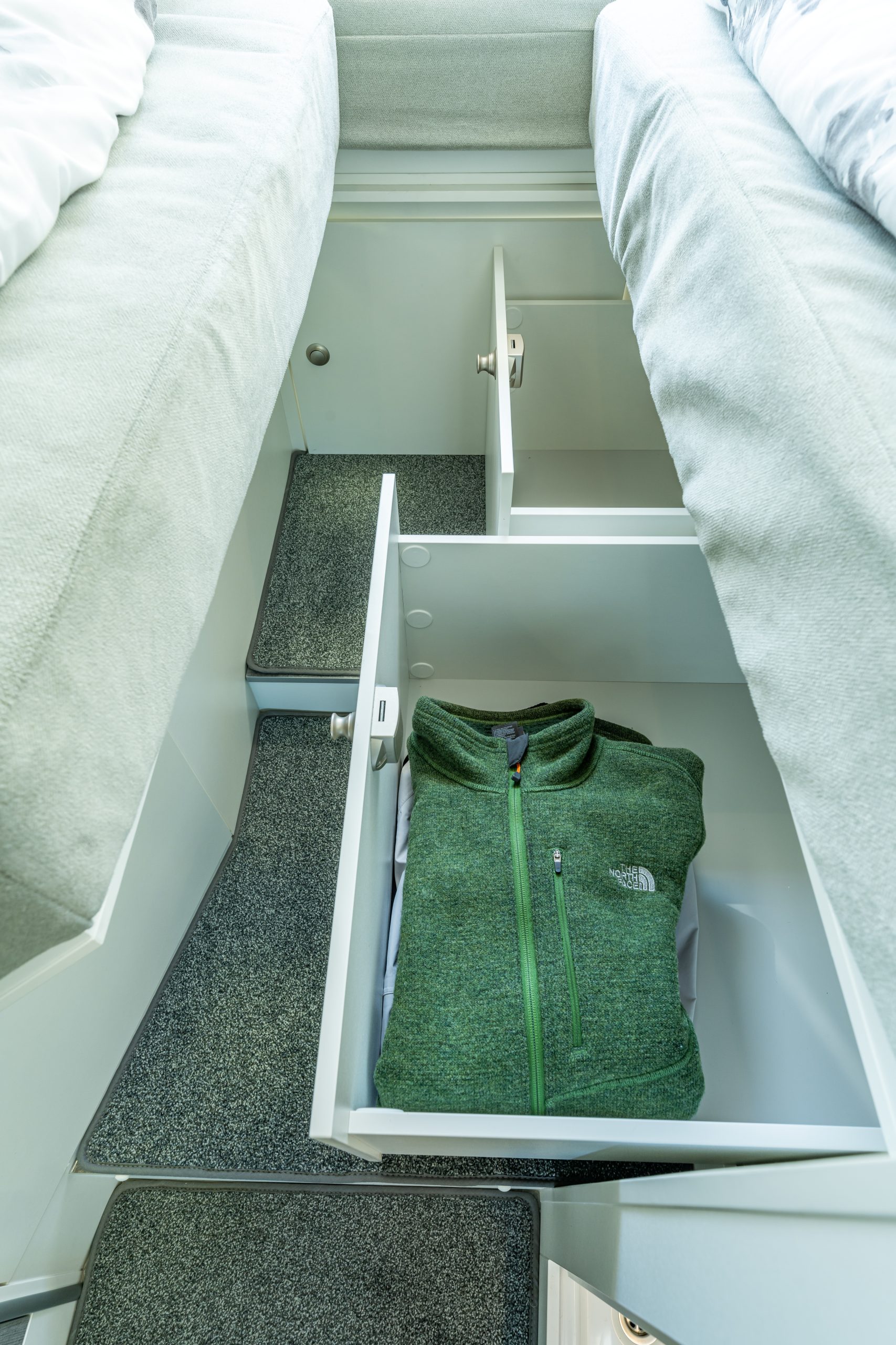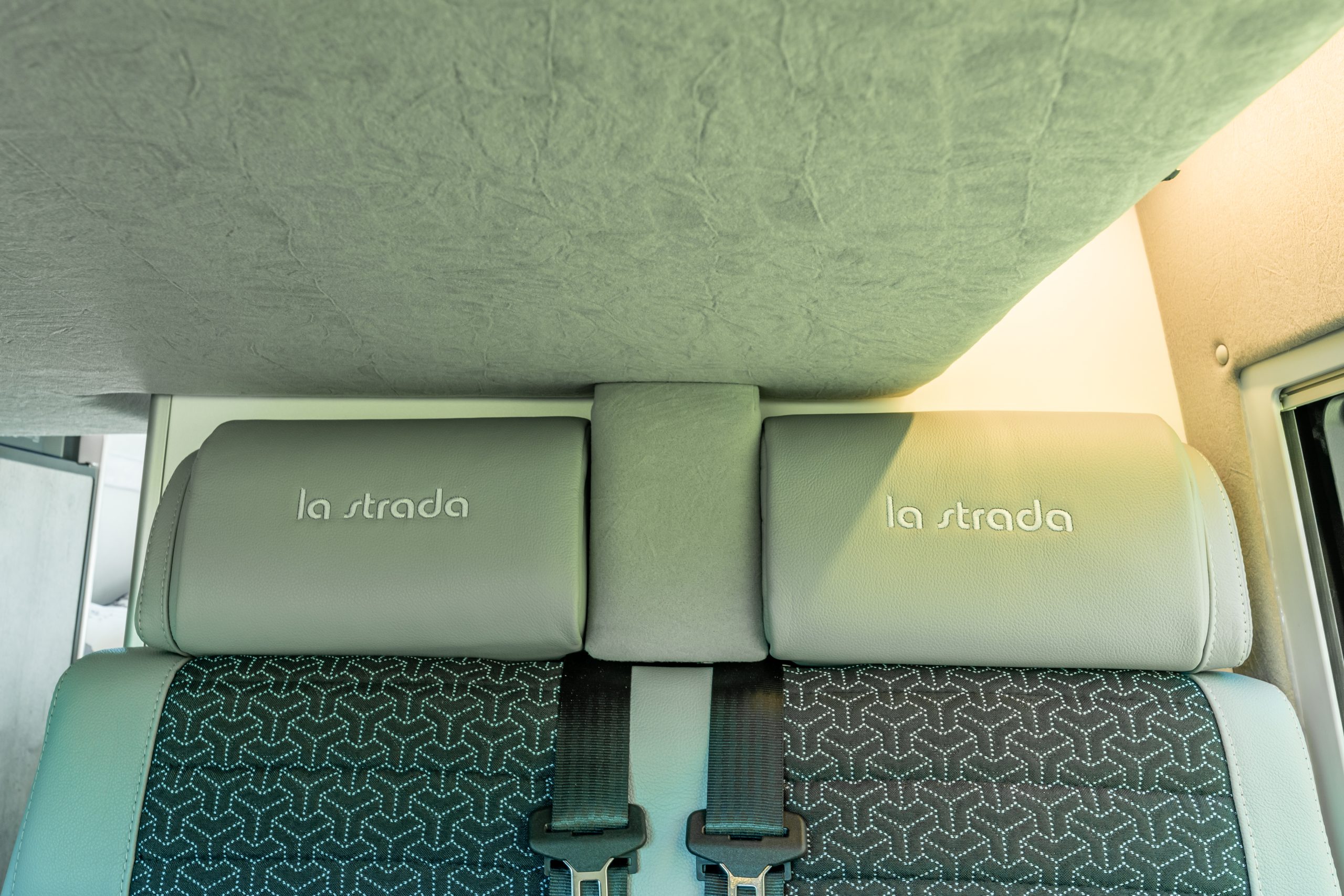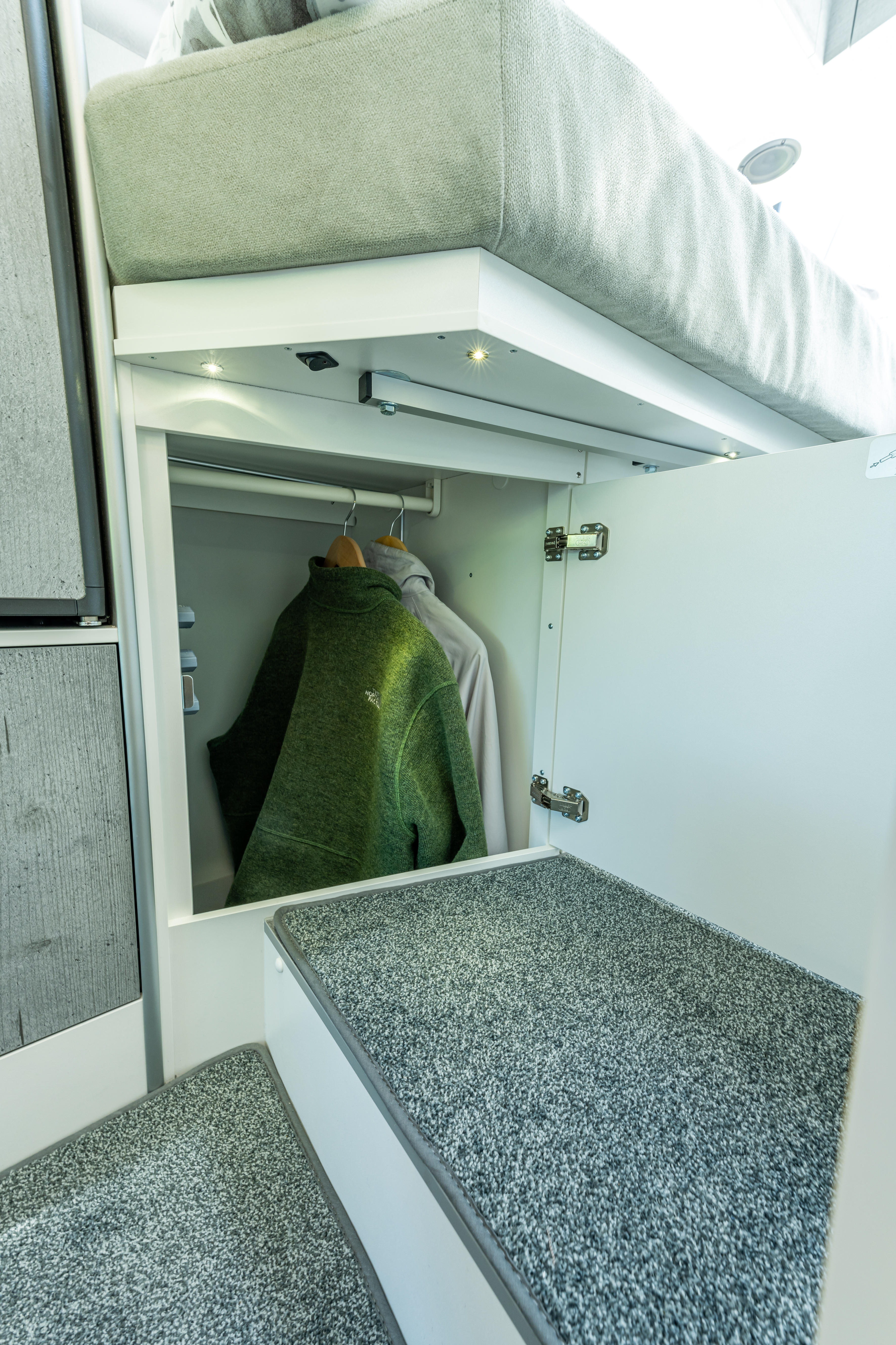Sowohl das Hubbett als auch die Einzelbetten im Heck sind mit Froli Tellerfedern und hochwertigen Kaltschaummatratzen ausgestattet. Die Einzelbetten im Heck des la strada Avanti EBF sind längs angeordnet und mit 1,95 Metern und 1,85 Metern unterschiedlich lang. Sie lassen sich mit wenigen Handgriffen in eine fast 2×2 Meter große Liegewiese umbauen. Unter den Einzelbetten gibt es viel Stauraum für Wäsche und andere Utensilien. Wer Kleidung auf Bügeln unterbringen muss, findet dafür unter dem Einzelbett auf der Beifahrerseite Platz. Unter dem Bett auf der Fahrerseite warten zwei große Auszüge auf die Aufnahme von gefalteter Kleidung. Dachschränke sind rund um die Einzelbetten im Heck platziert.